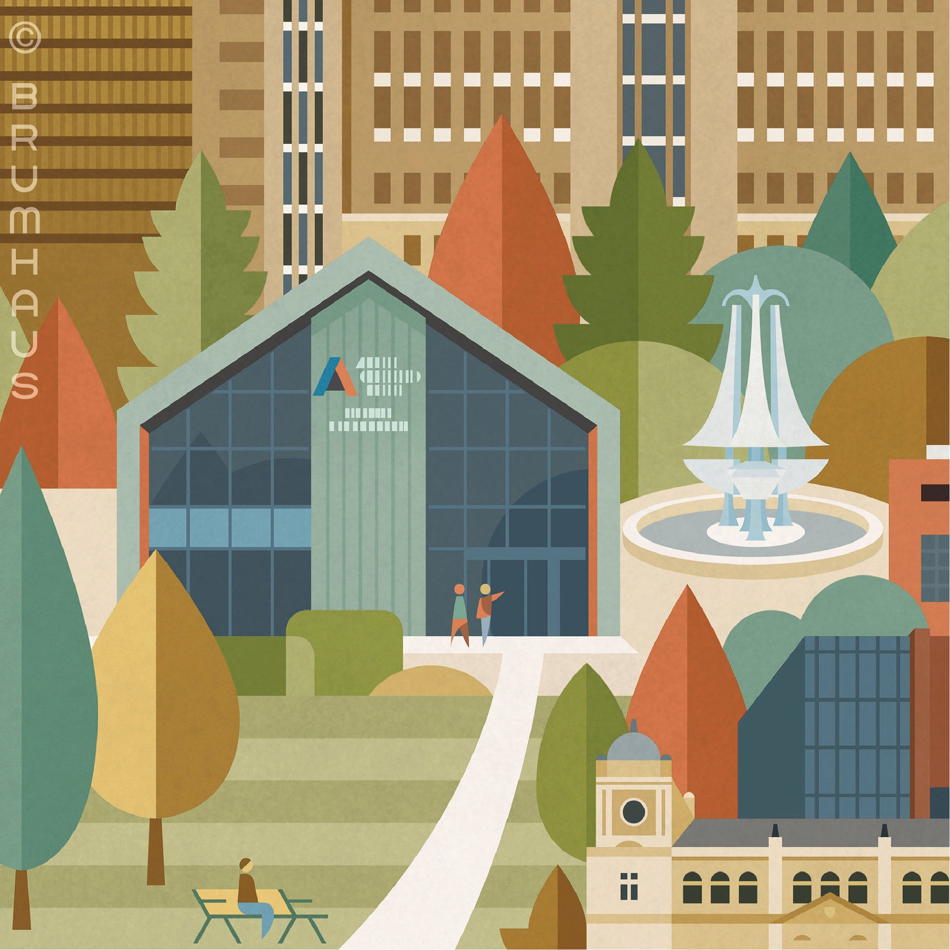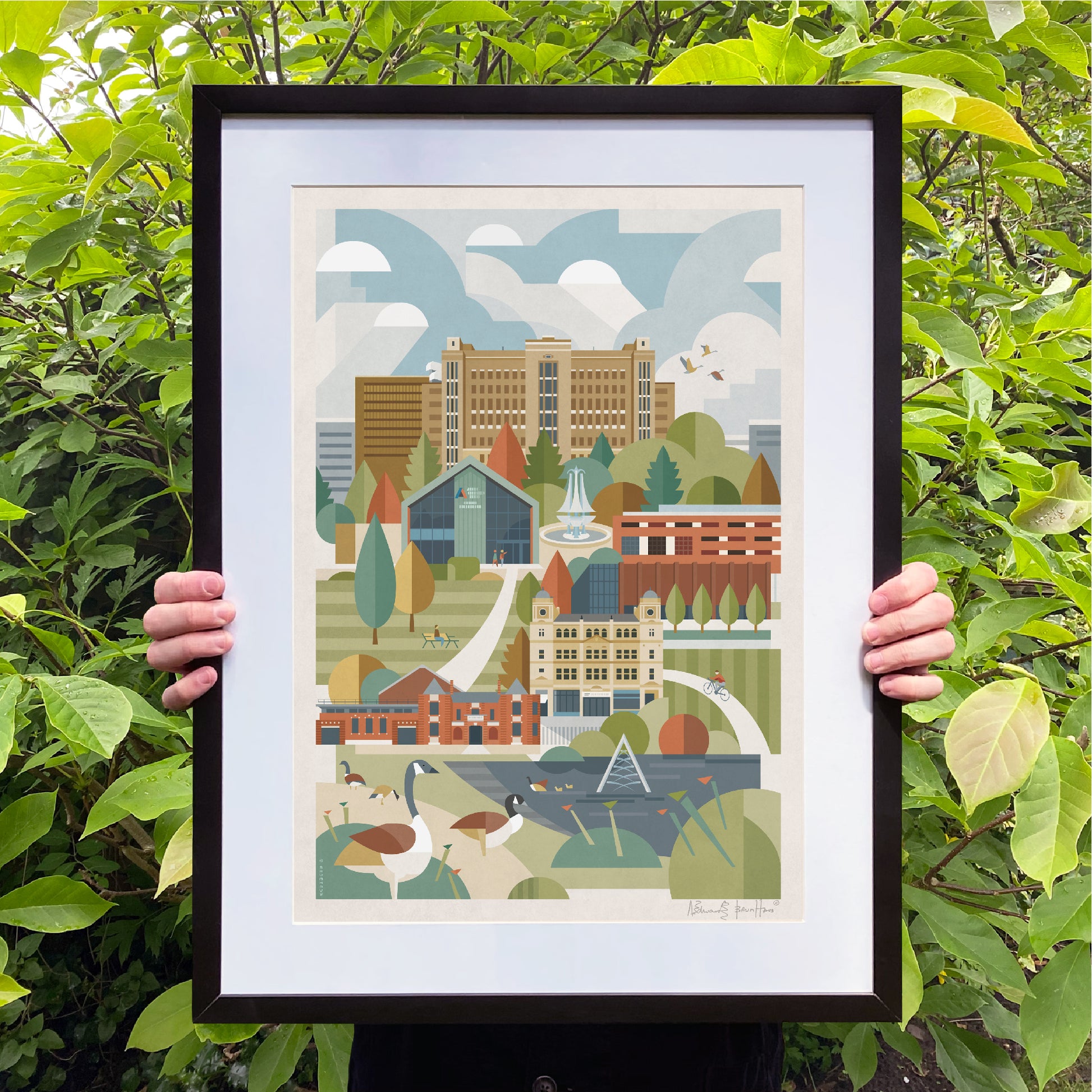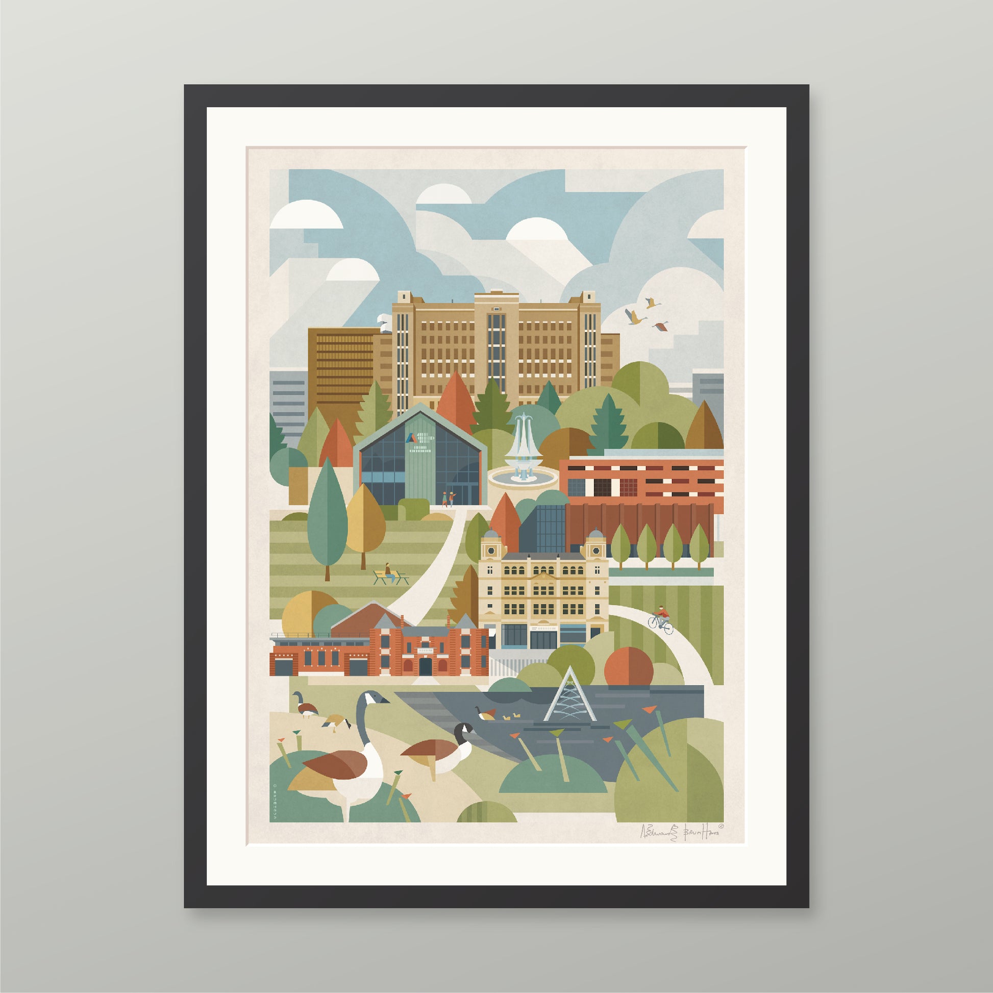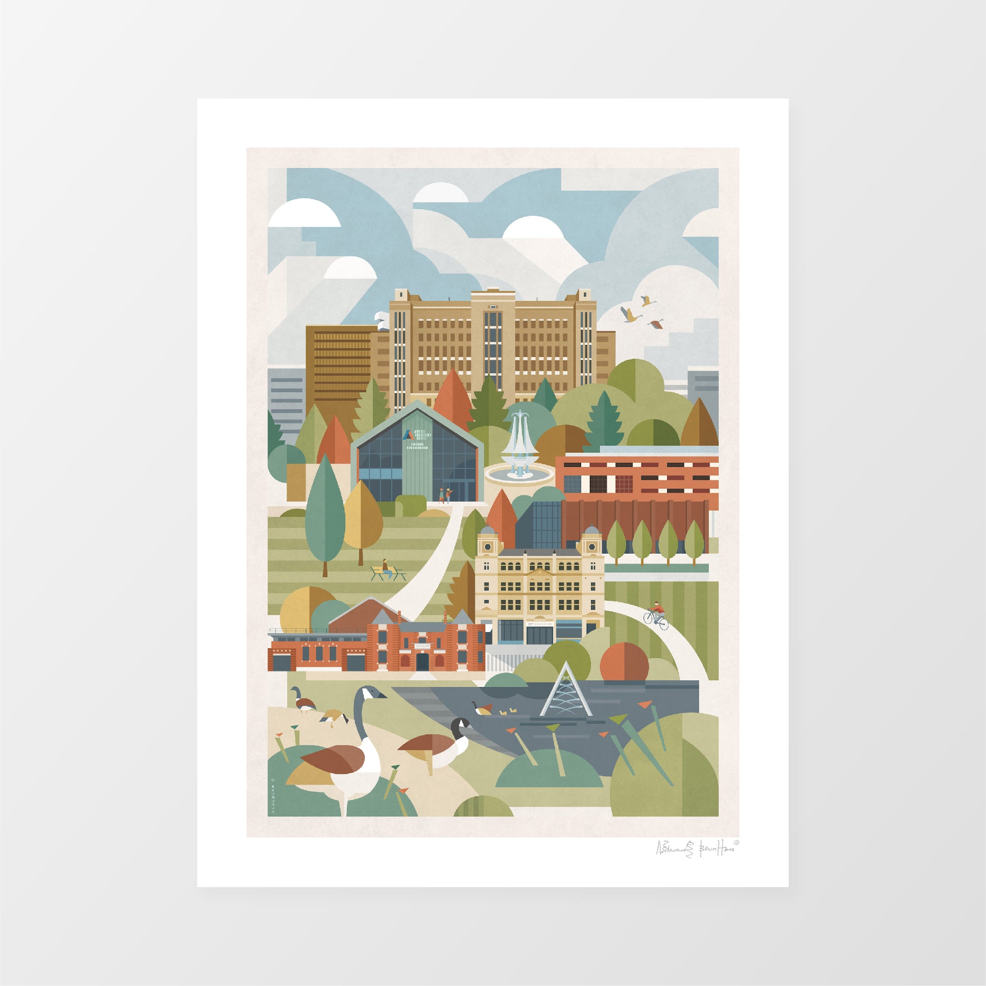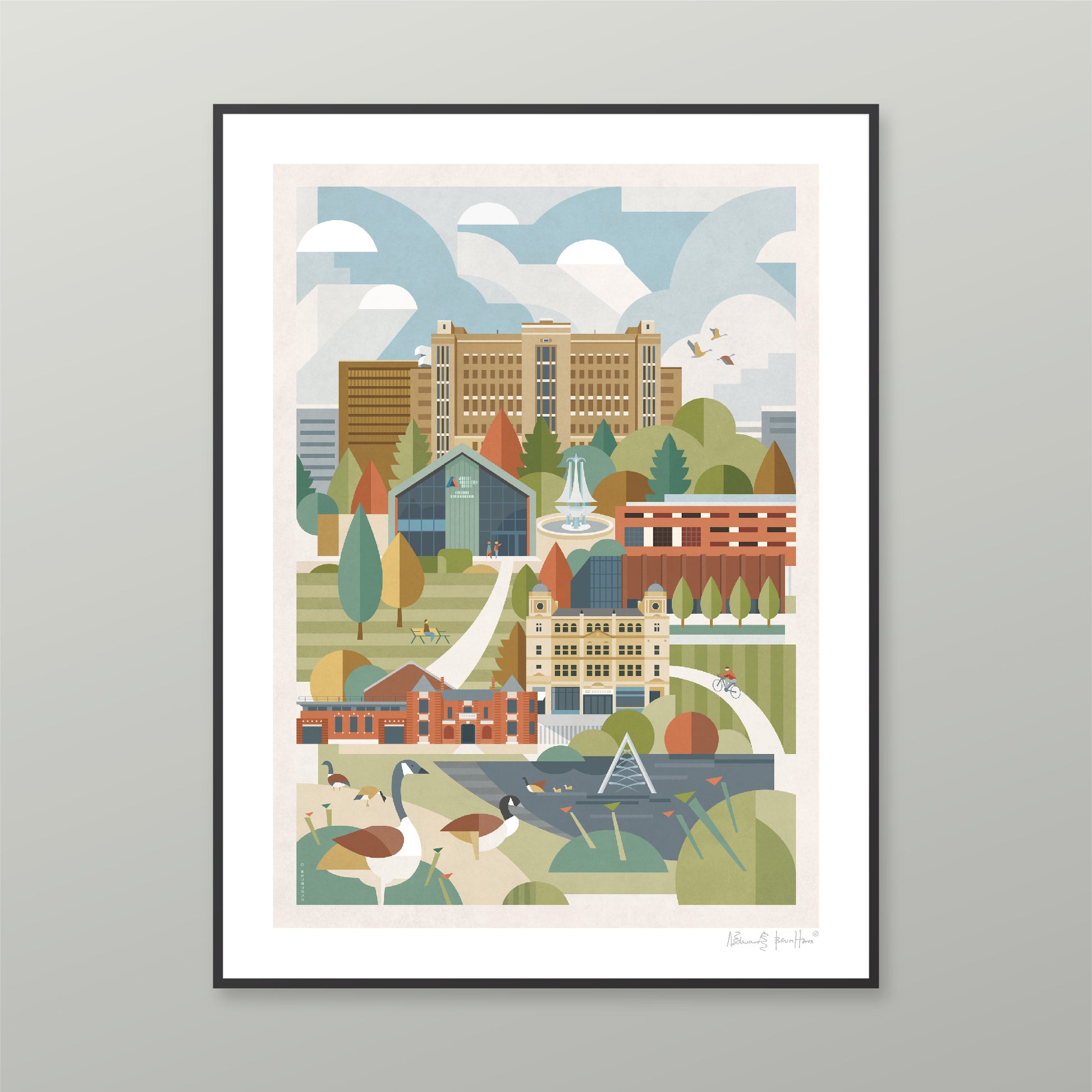 This striking digital artwork captures the essence of Aston University. Bold lines and vibrant colours bring the campus to life in this captivating print. From the sleek modern architecture to the lush greenery, every detail is meticulously crafted to evoke the energy and innovation of the university.