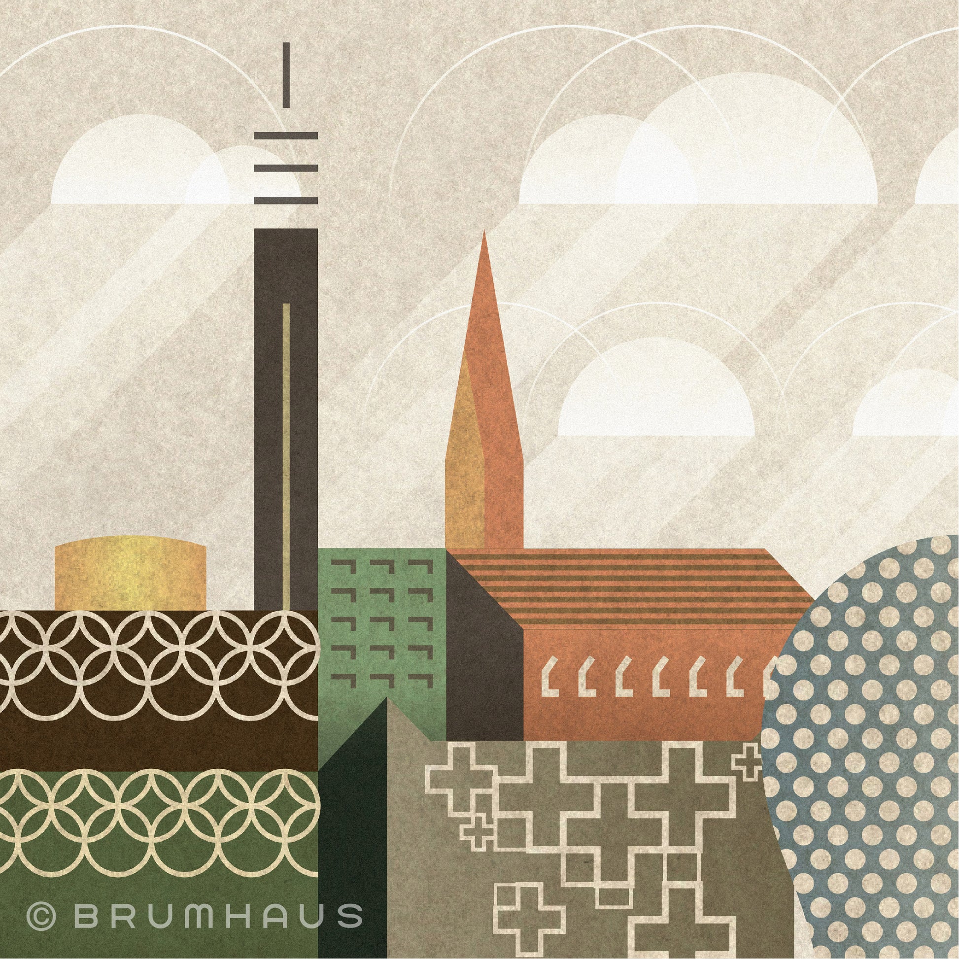 The earthy colours are organic and the patterns displayed show semi-abstract architectural features. Many of the buildings featured are recognisable landmarks. This work is yet another tribute to the city of Birmingham.