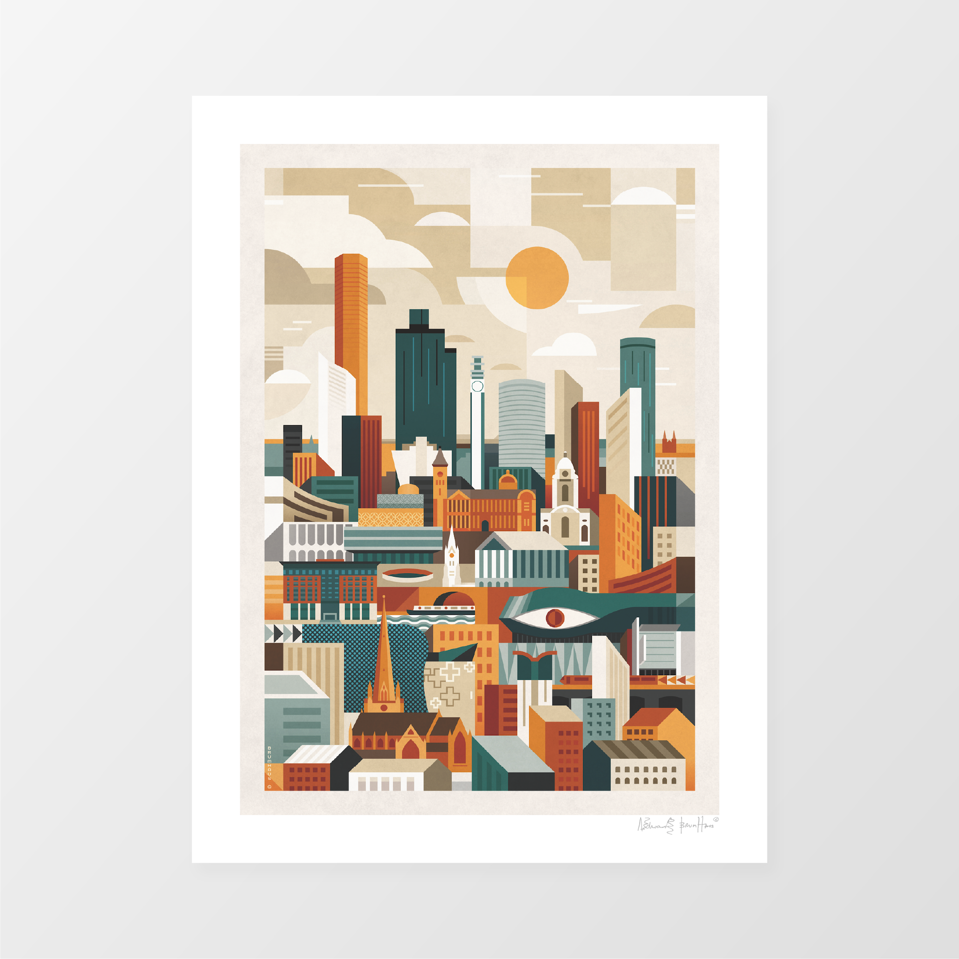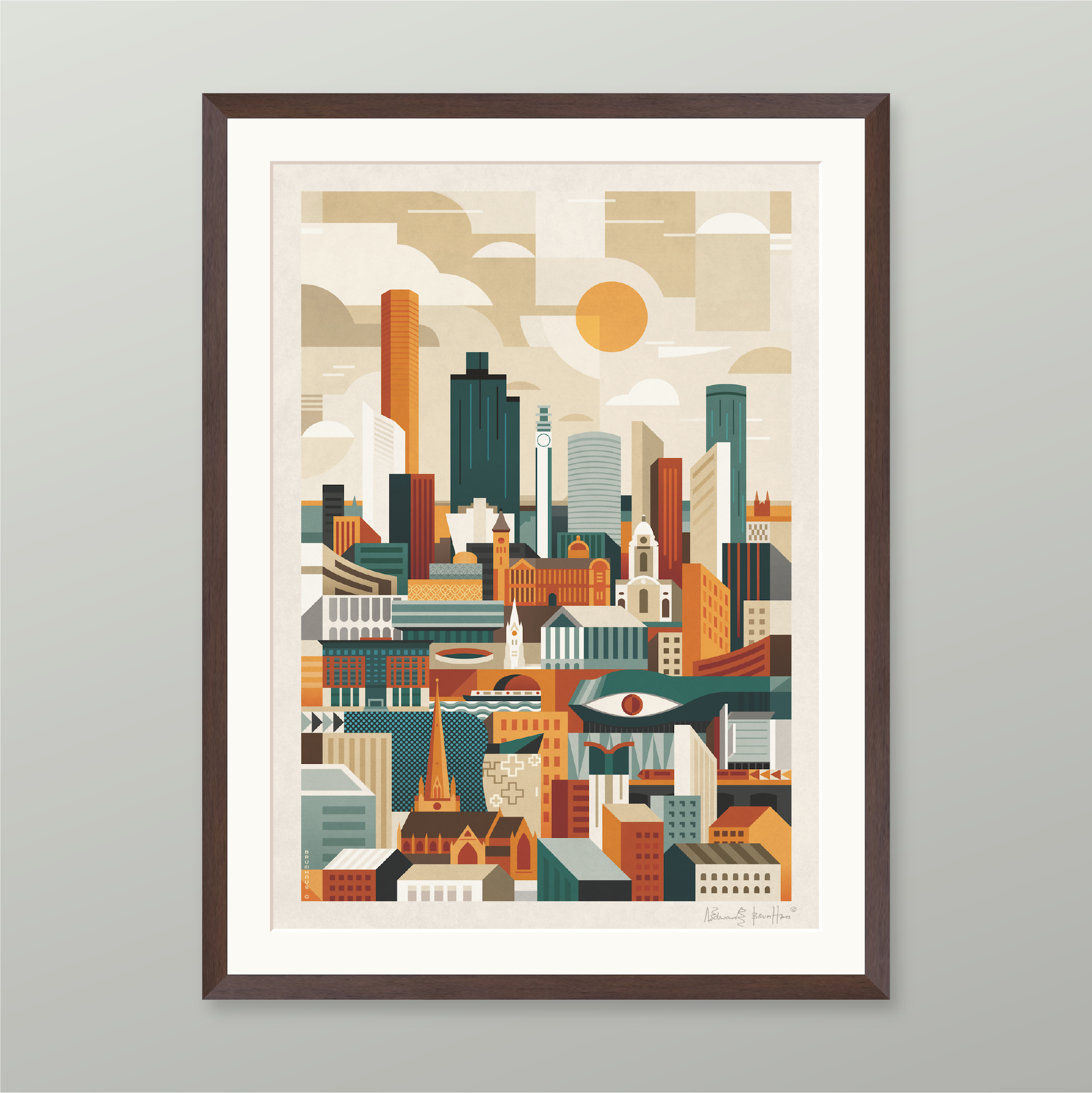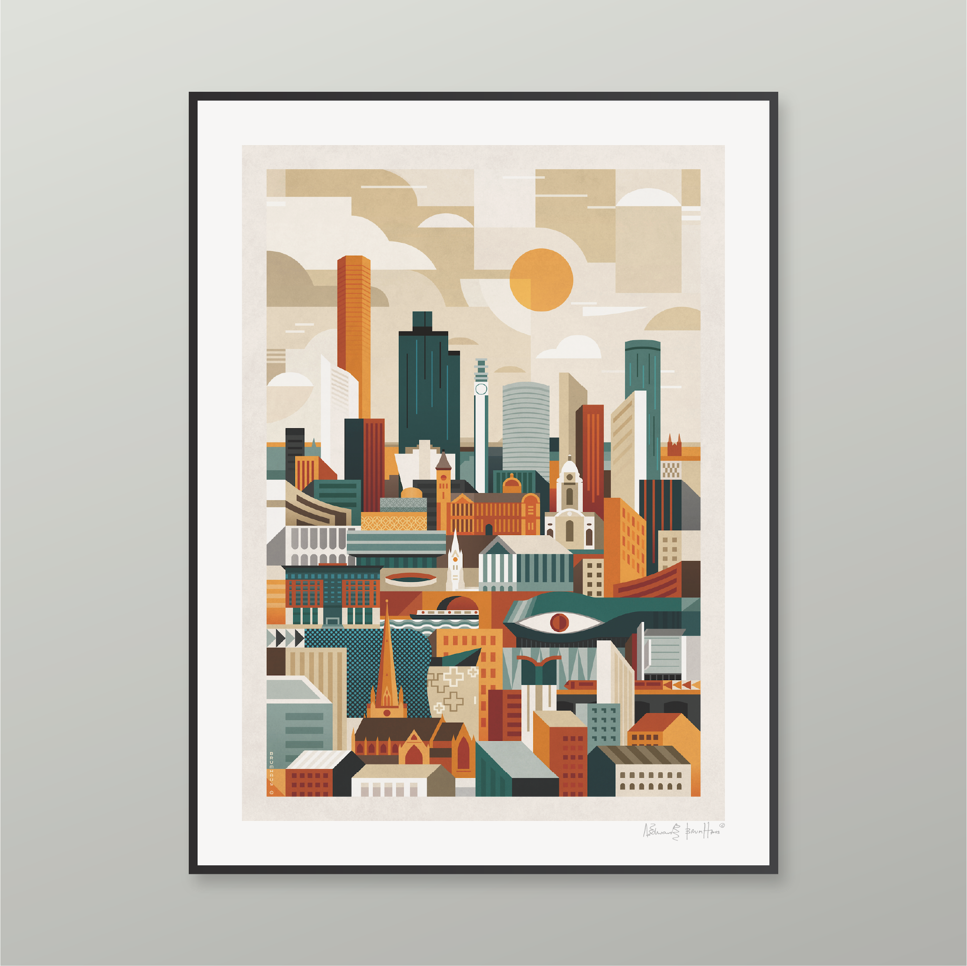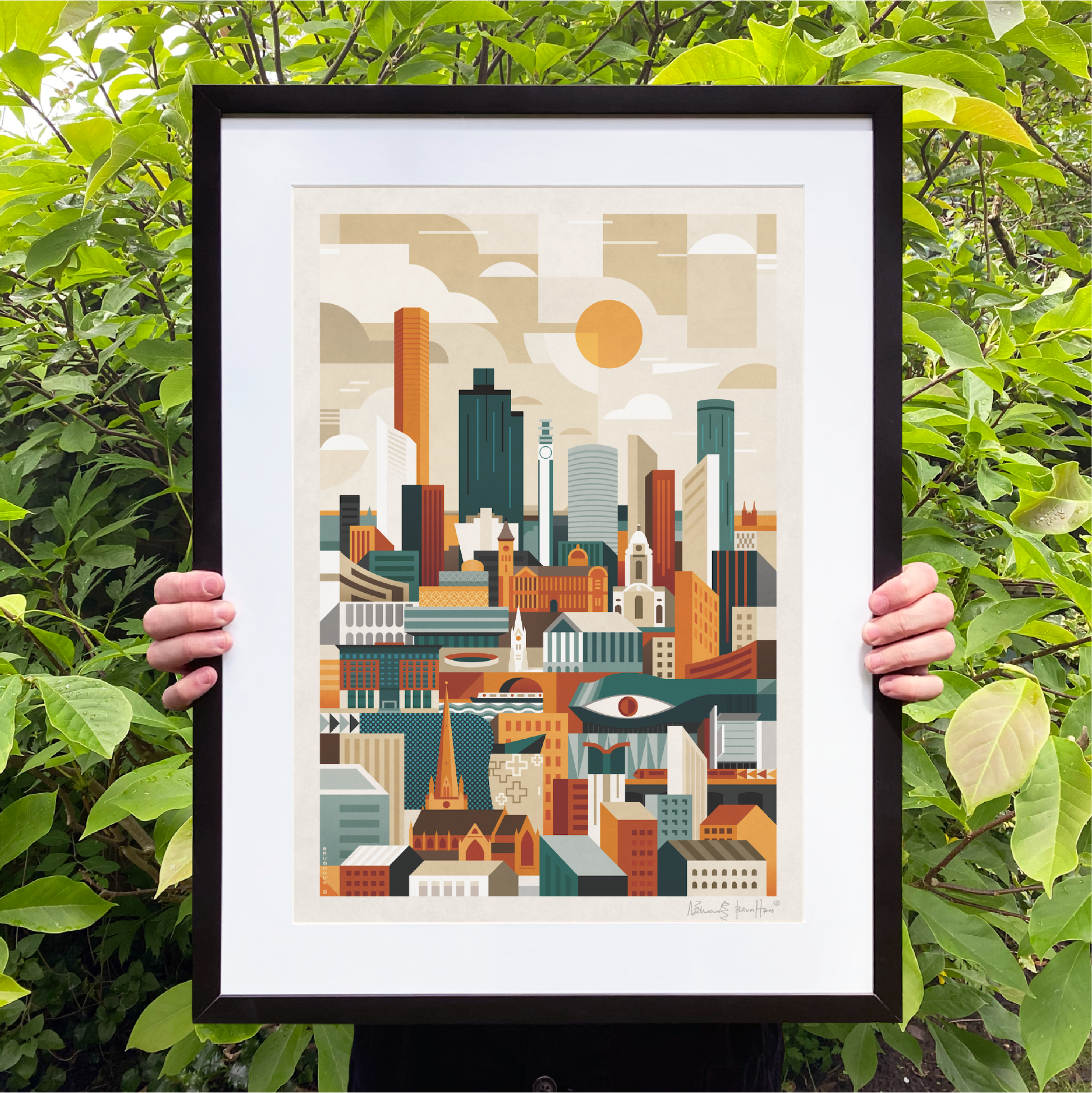 The piece captures the dynamic contrast between old and new architecture, set against a calm, stylised sky. Warm ochres, deep teals, and soft neutrals reflect the city’s industrial heritage and creative spirit, while bold geometric forms give a sense of rhythm and structure.