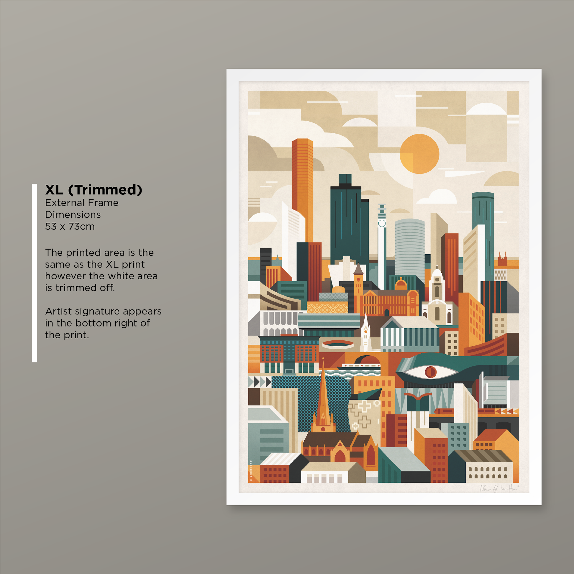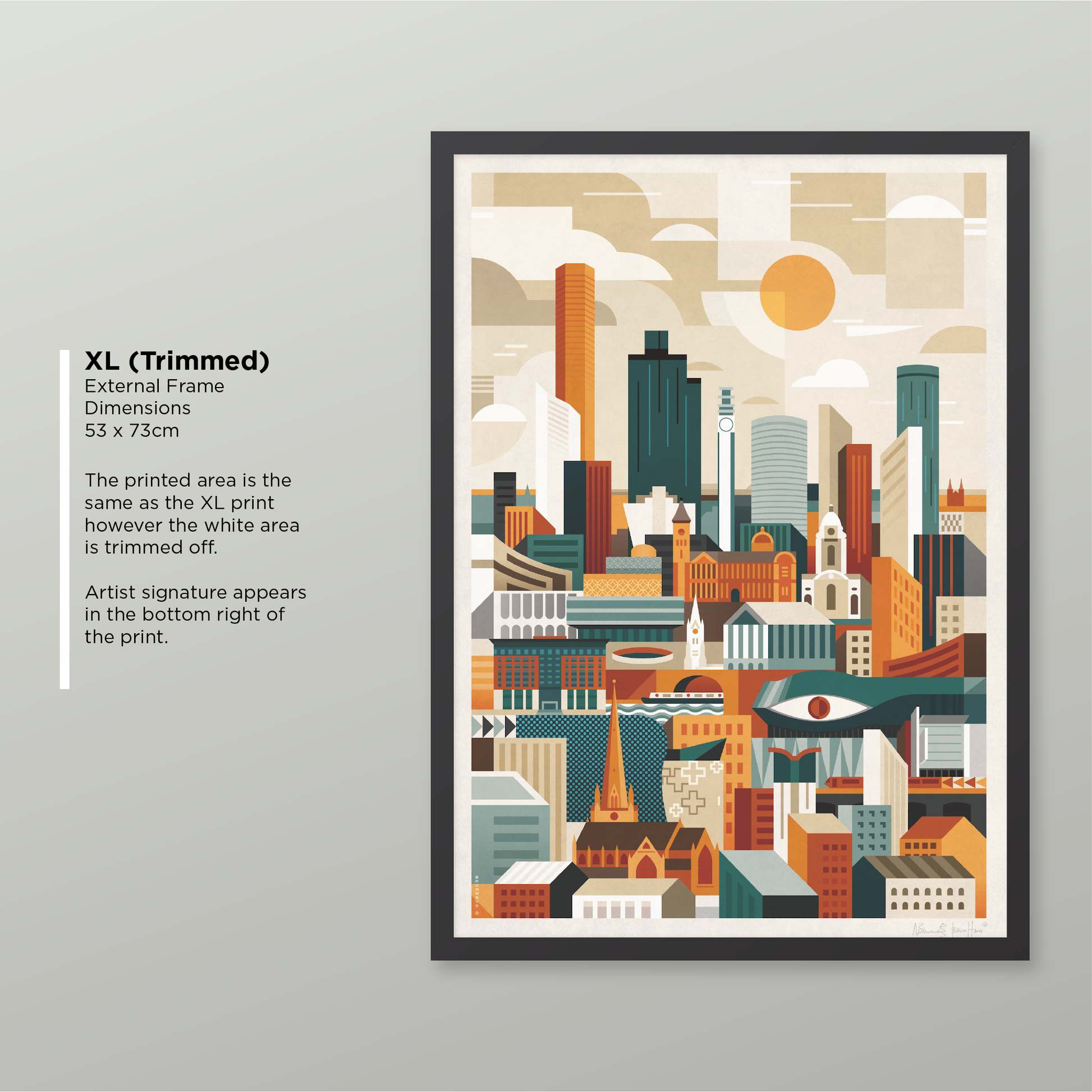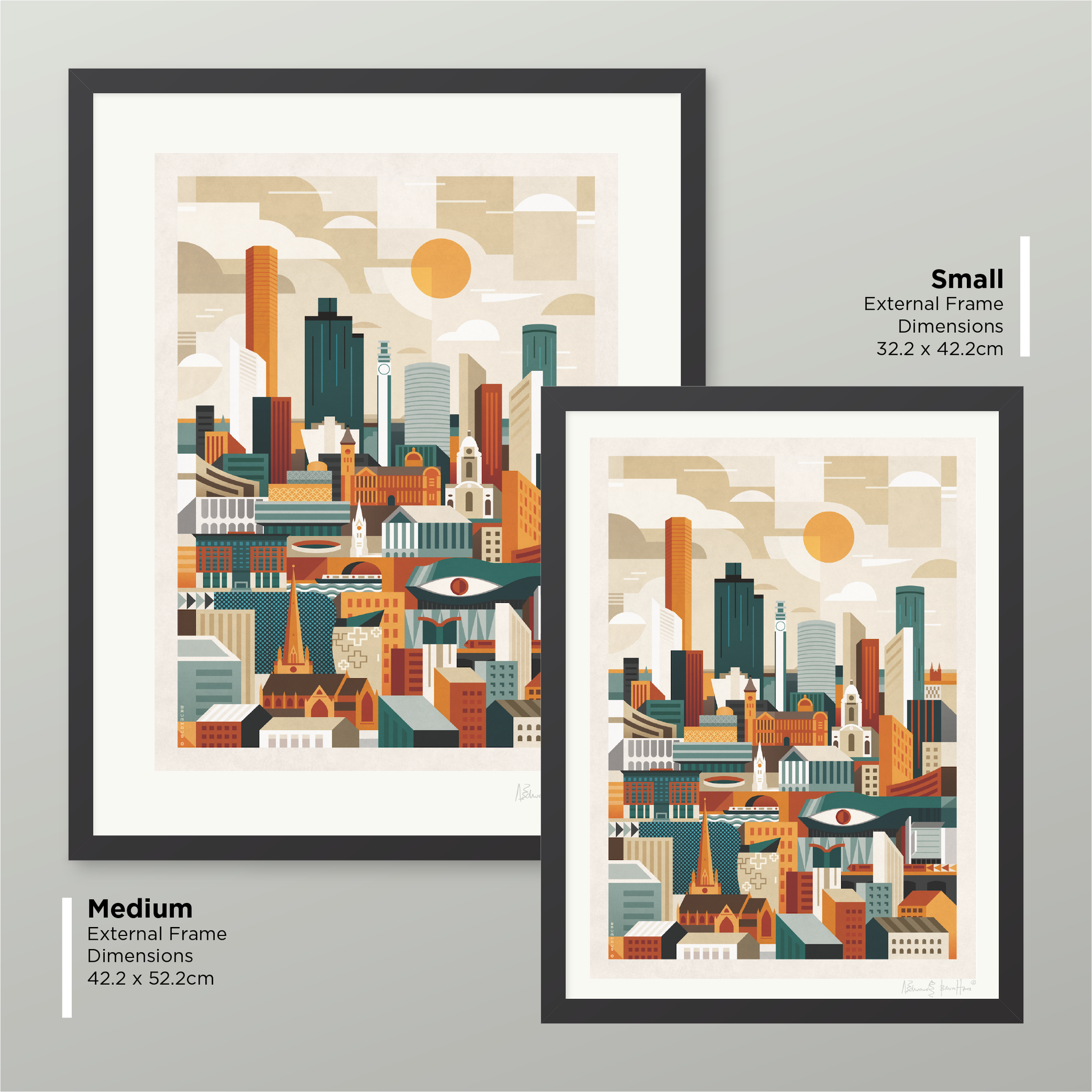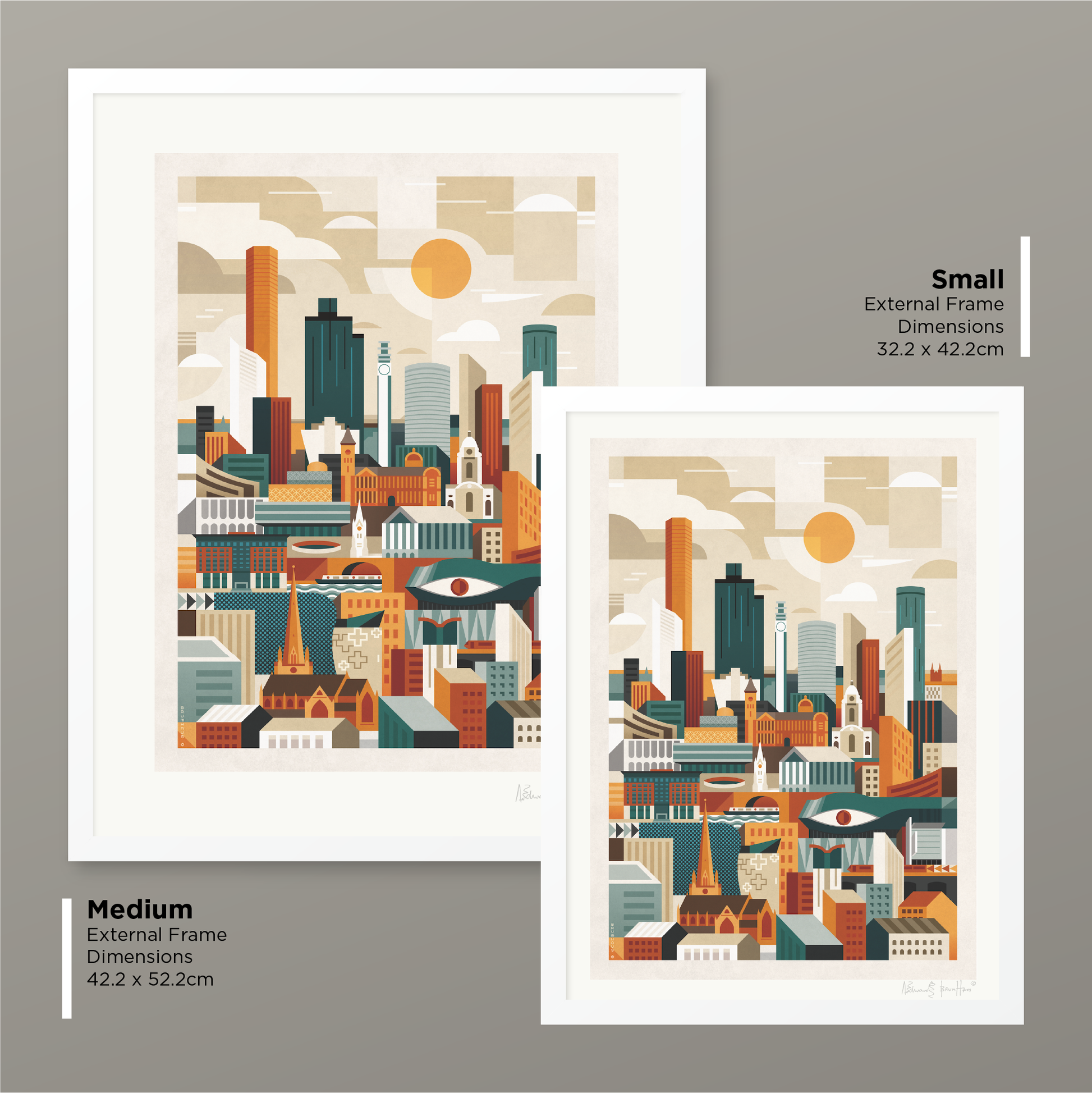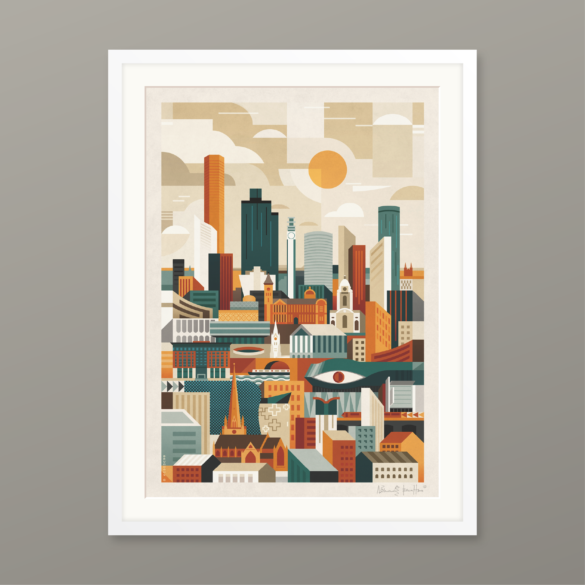 The piece captures the dynamic contrast between old and new architecture, set against a calm, stylised sky. Warm ochres, deep teals, and soft neutrals reflect the city’s industrial heritage and creative spirit, while bold geometric forms give a sense of rhythm and structure.