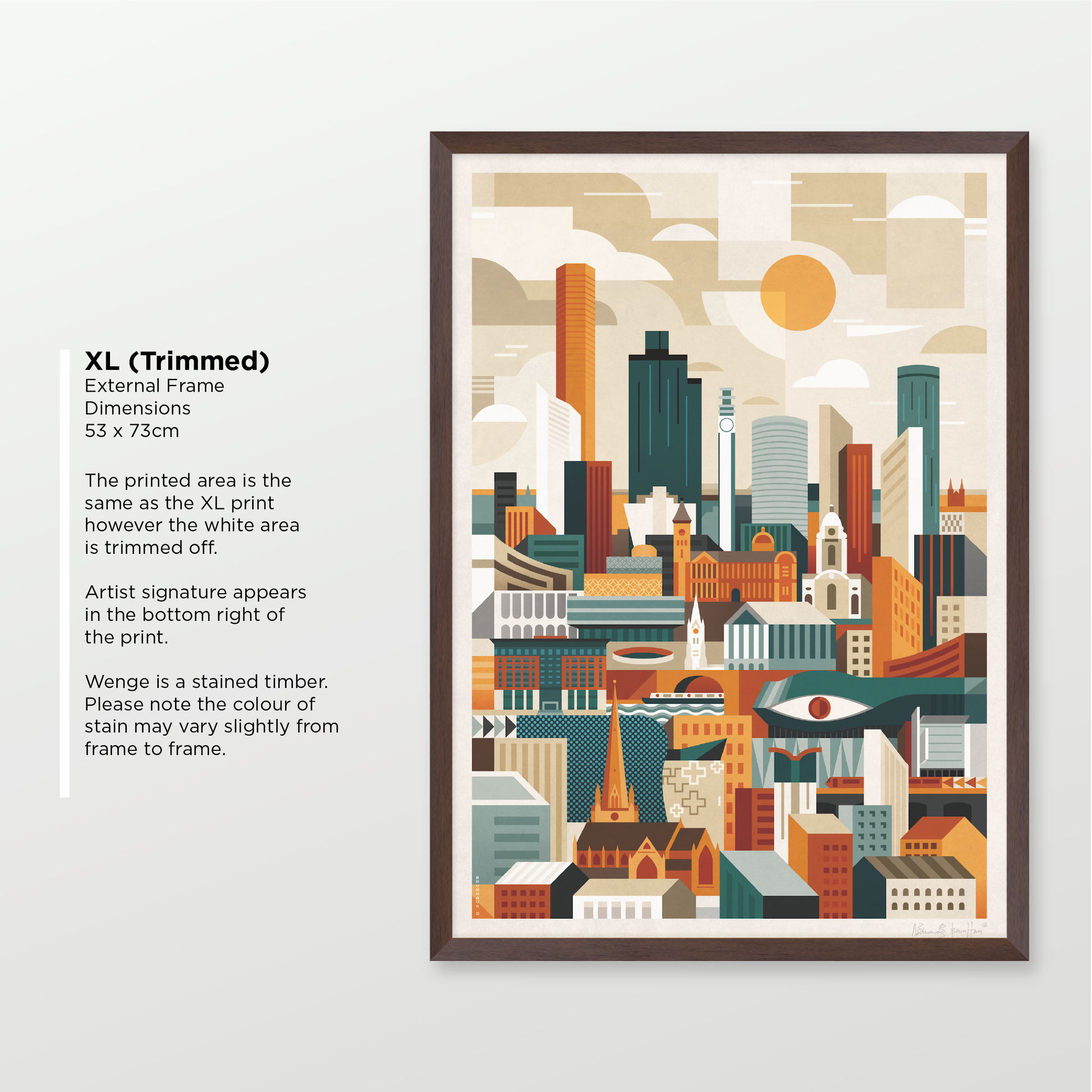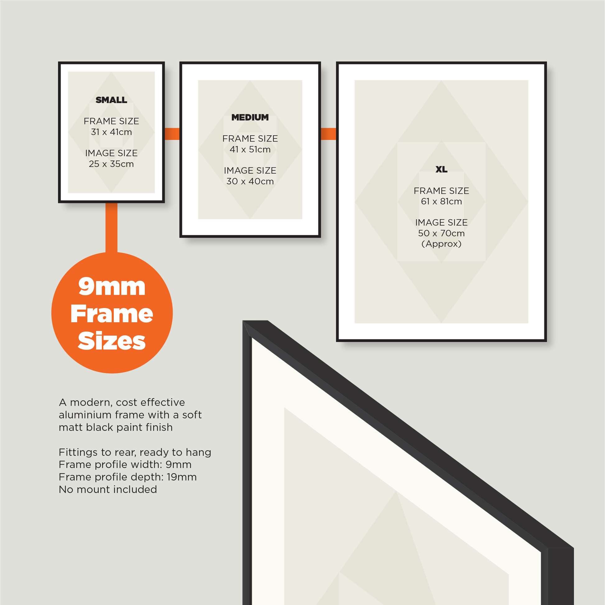 XL option is trimmed to the printed area to suit the frame size, and is overall smaller than the XL 23mm frame option. Signature is within the printed area, bottom right.
