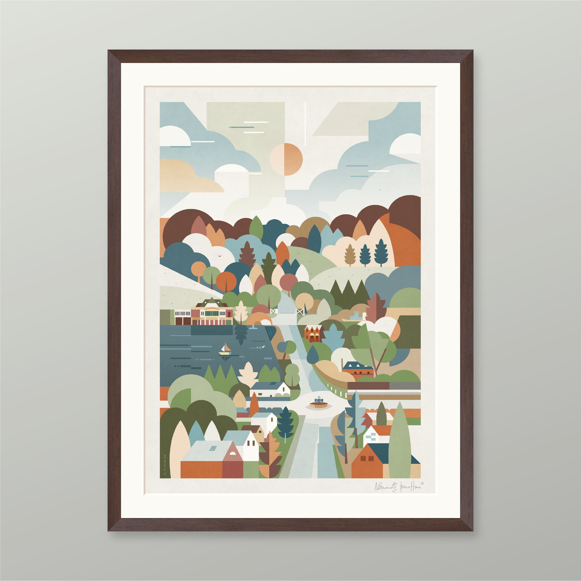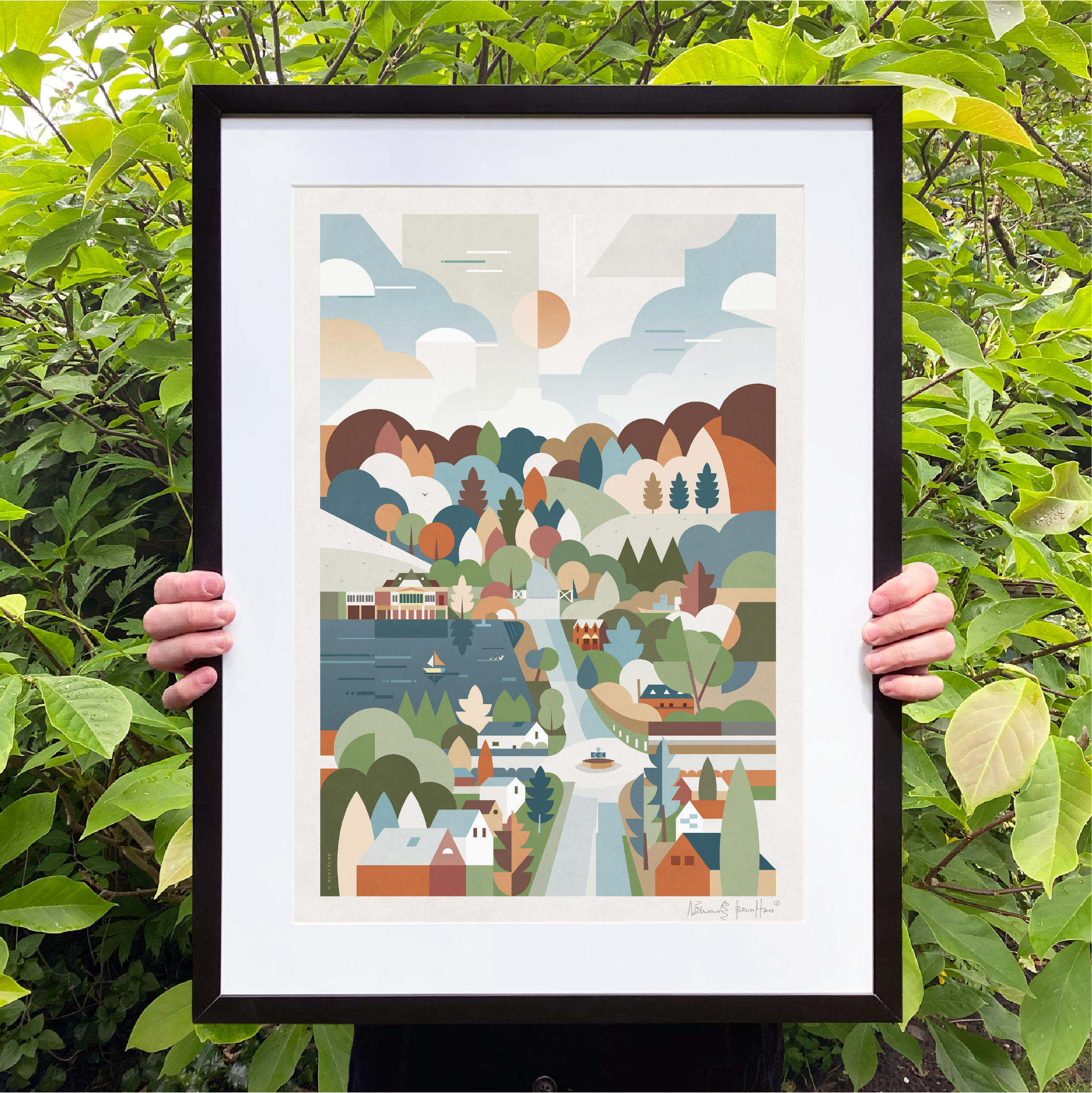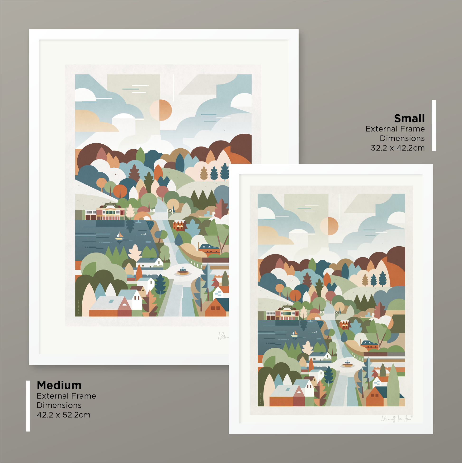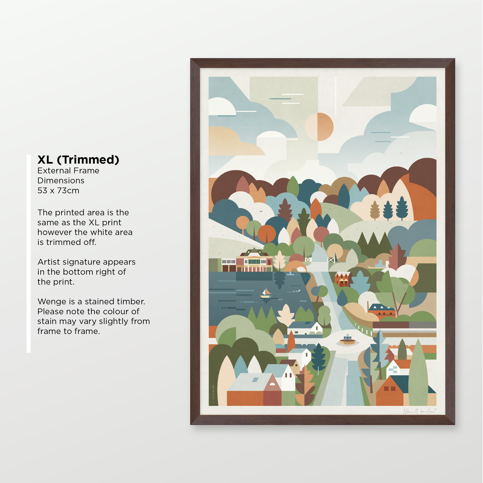 Consisting of a timber frame painted black or white with a smooth finish, or in dark walnut. These come with a white mount, except for the trimmed option. Please note the artist signature appears in the printed area on this option.