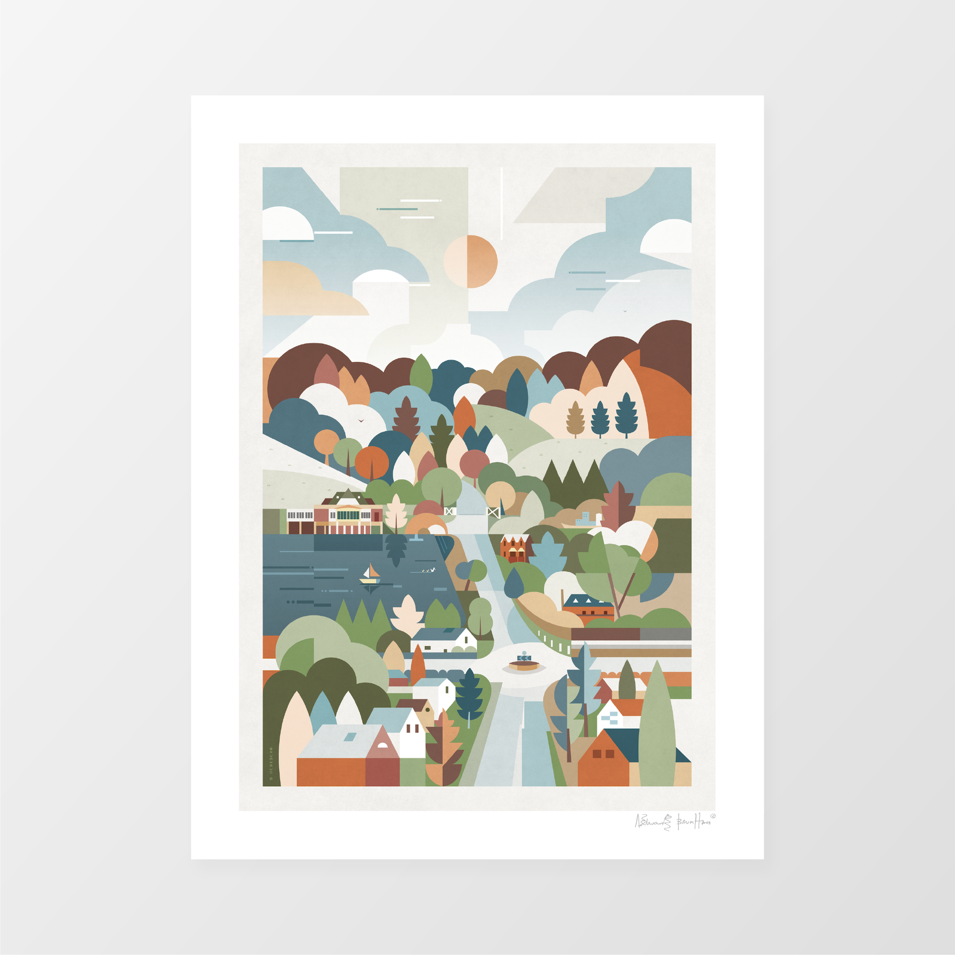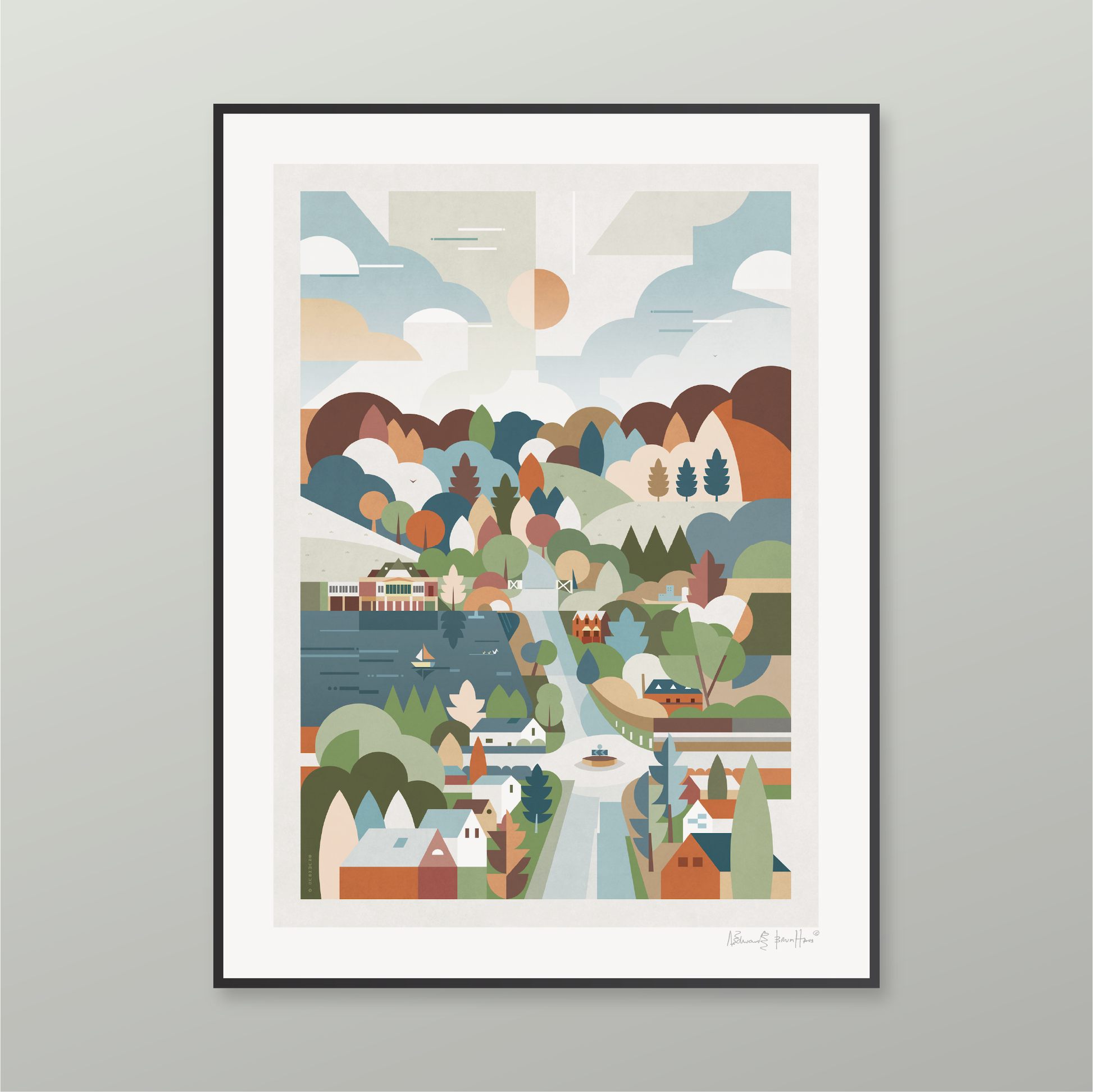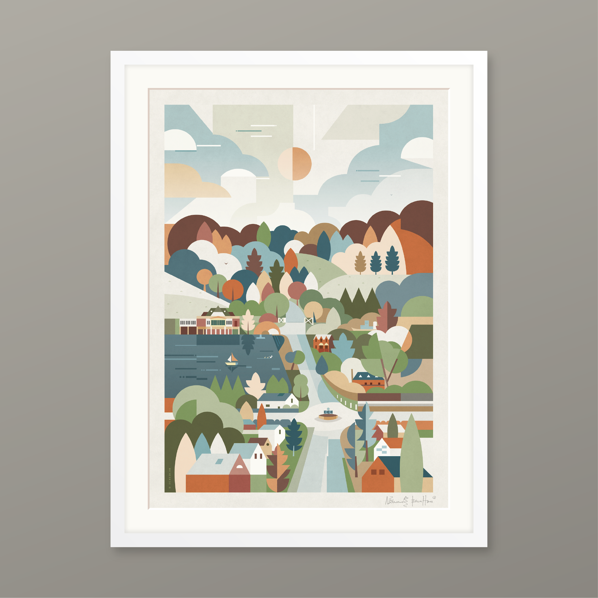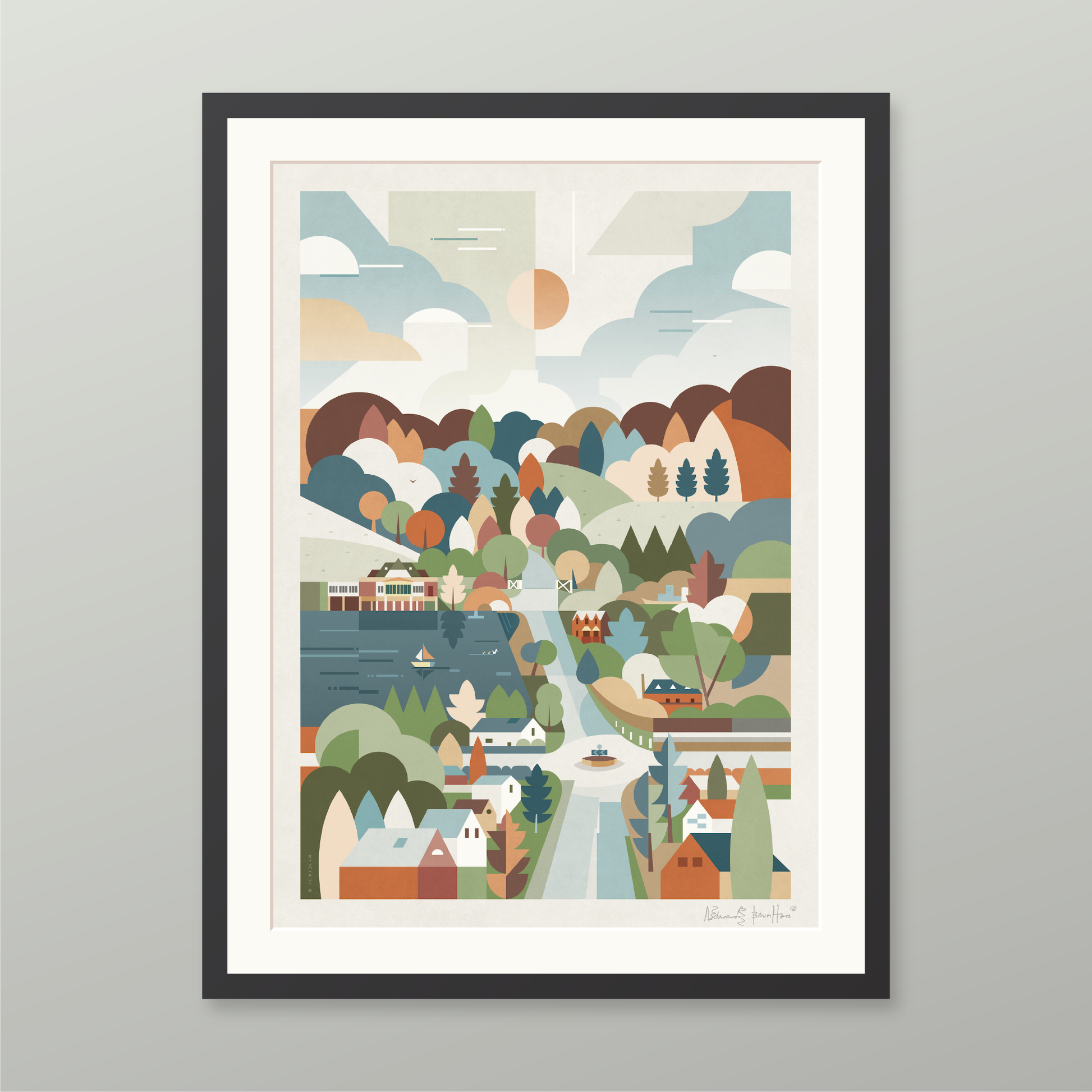 Consisting of a timber frame painted black or white with a smooth finish, or in dark walnut. These come with a white mount, except for the trimmed option. Please note the artist signature appears in the printed area on this option.