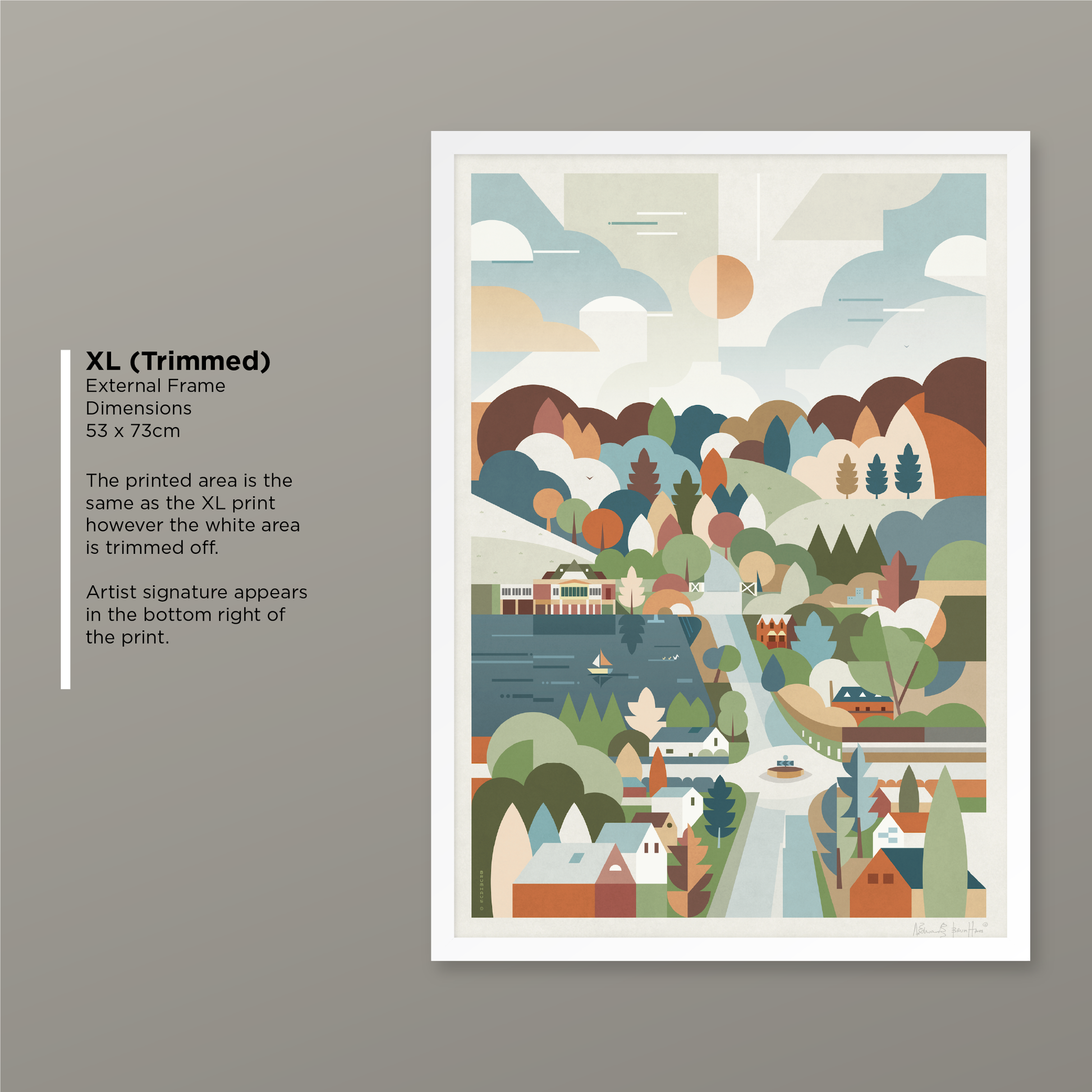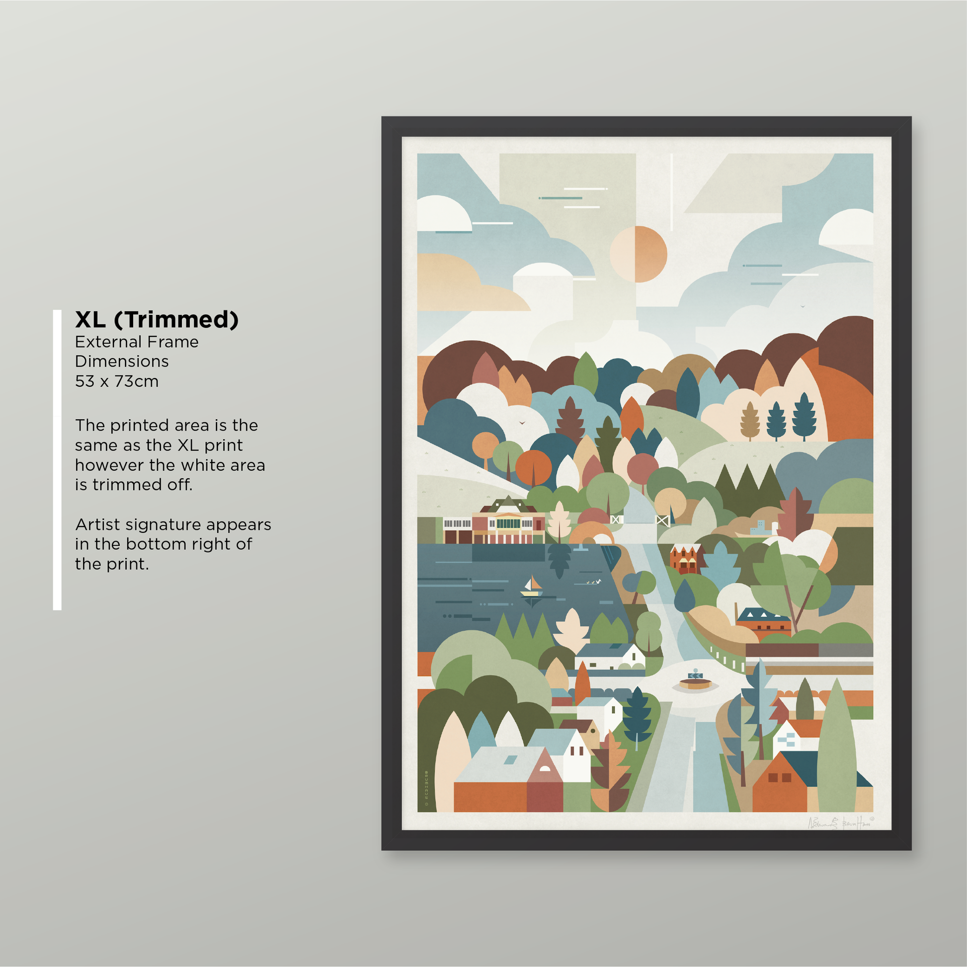 XL option is trimmed to the printed area to suit the frame size, and is overall smaller than the XL 23mm frame option. Signature is within the printed area, bottom right.