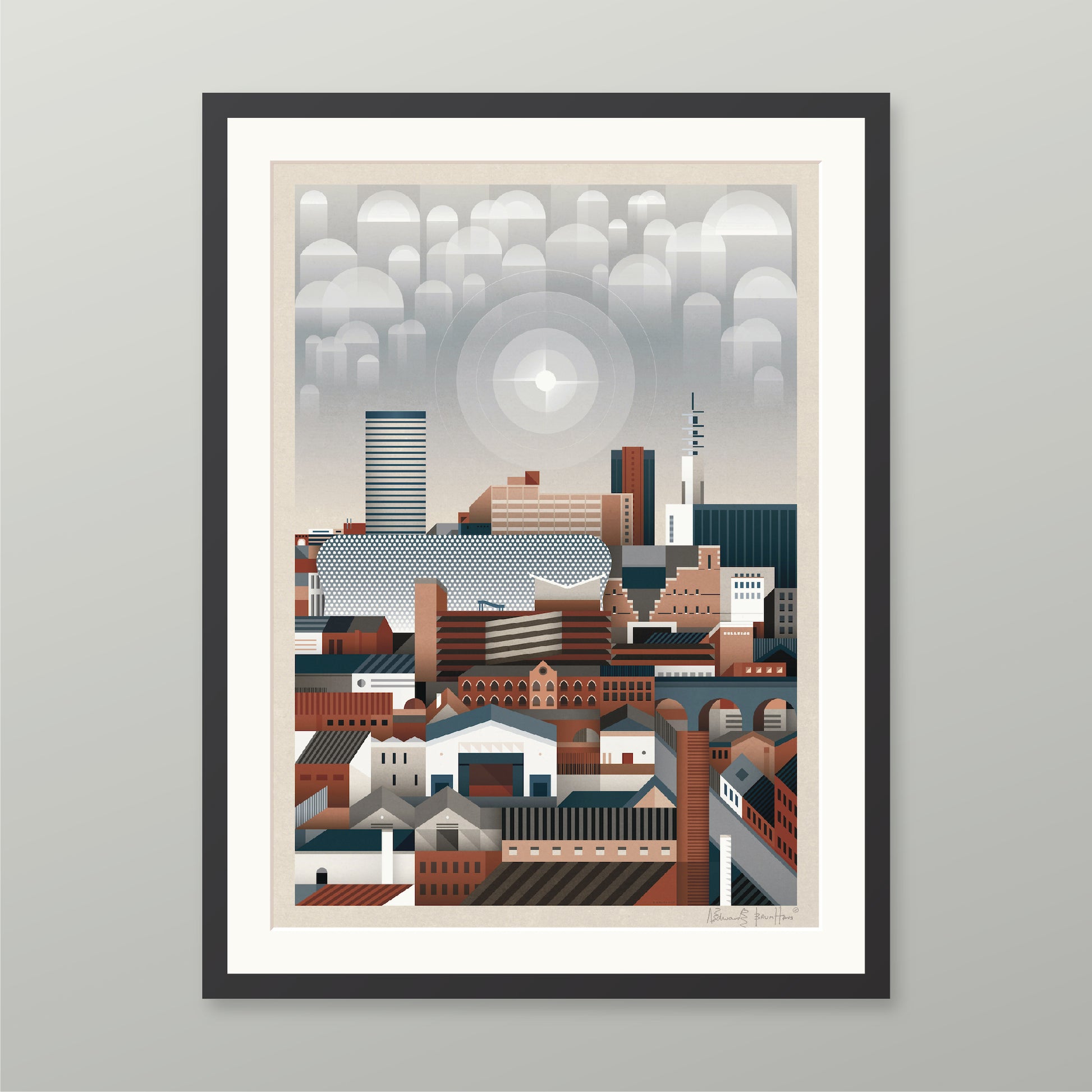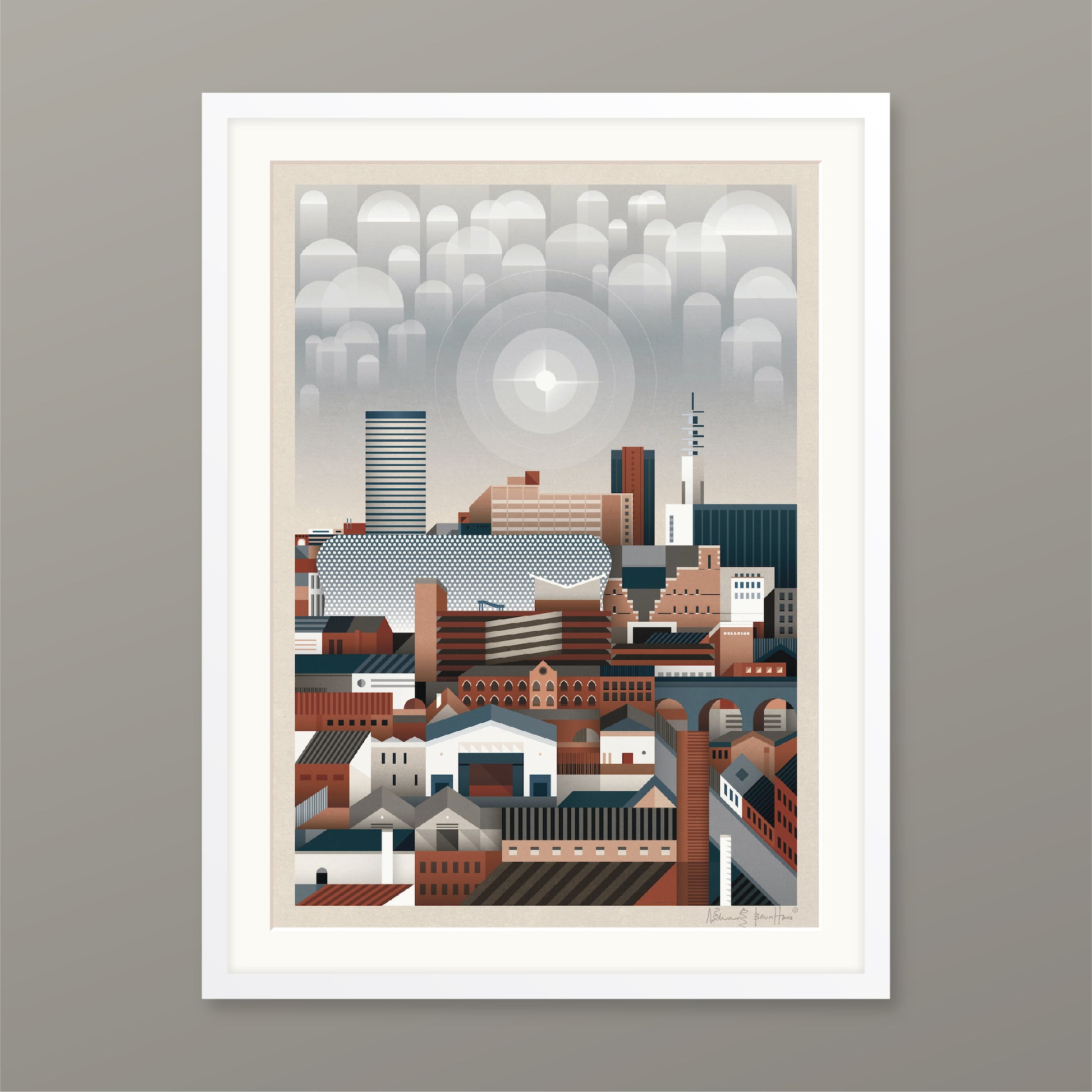 As seen from the Custard Factory, this view shows the stunning skyline of Birmingham, UK. Featuring the iconic Rotunda, the Selfridges building and the BT Tower.