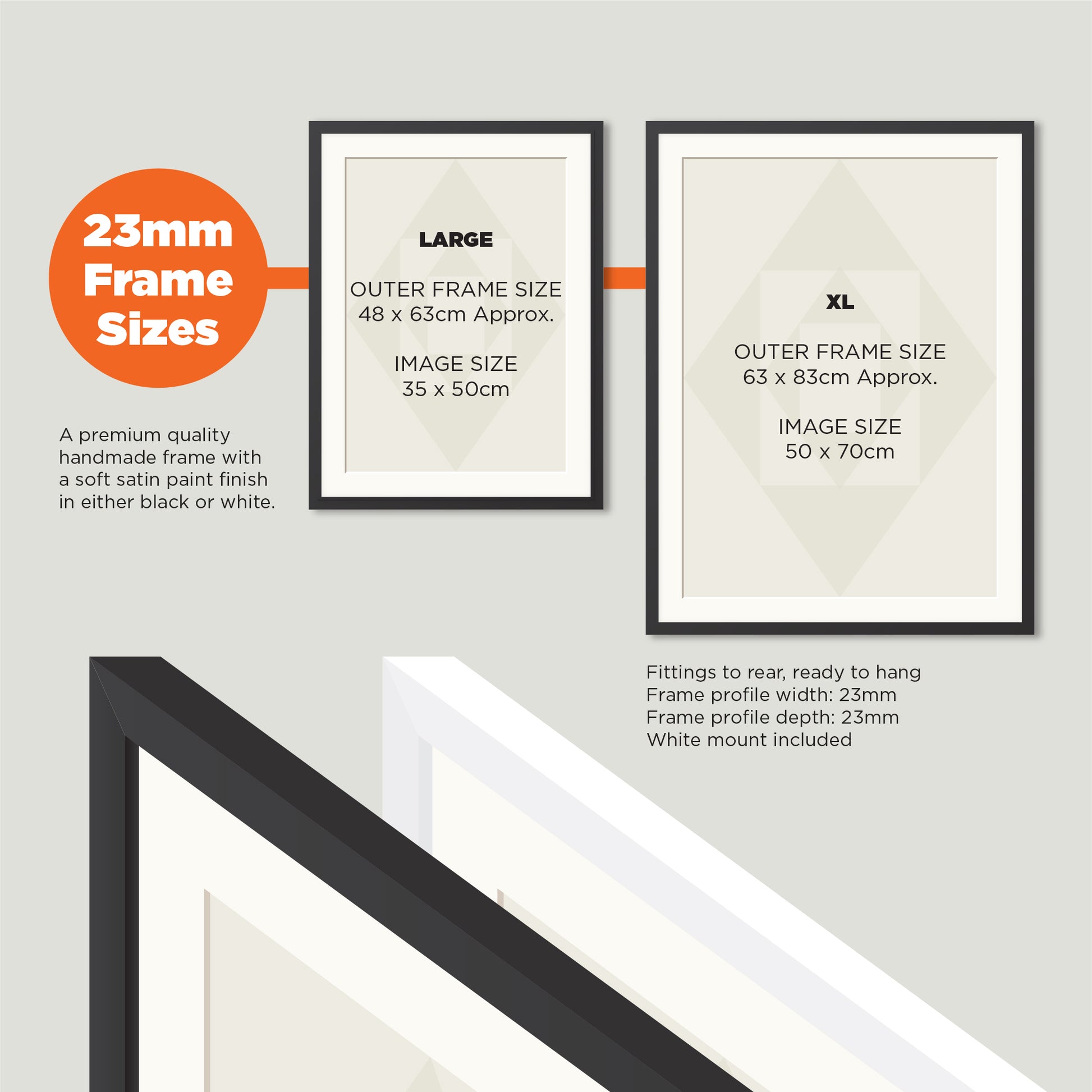 XL option is trimmed to the printed area to suit the frame size, and is overall smaller than the XL 23mm frame option. Signature is within the printed area, bottom right.
