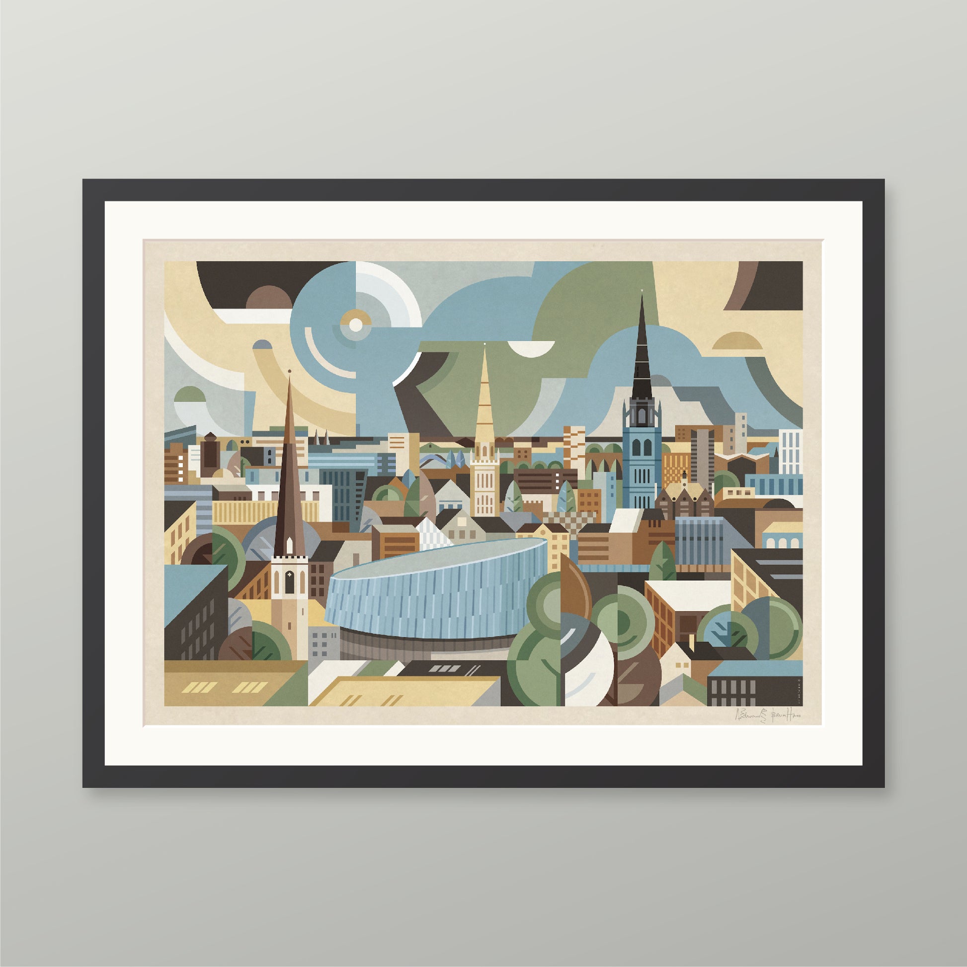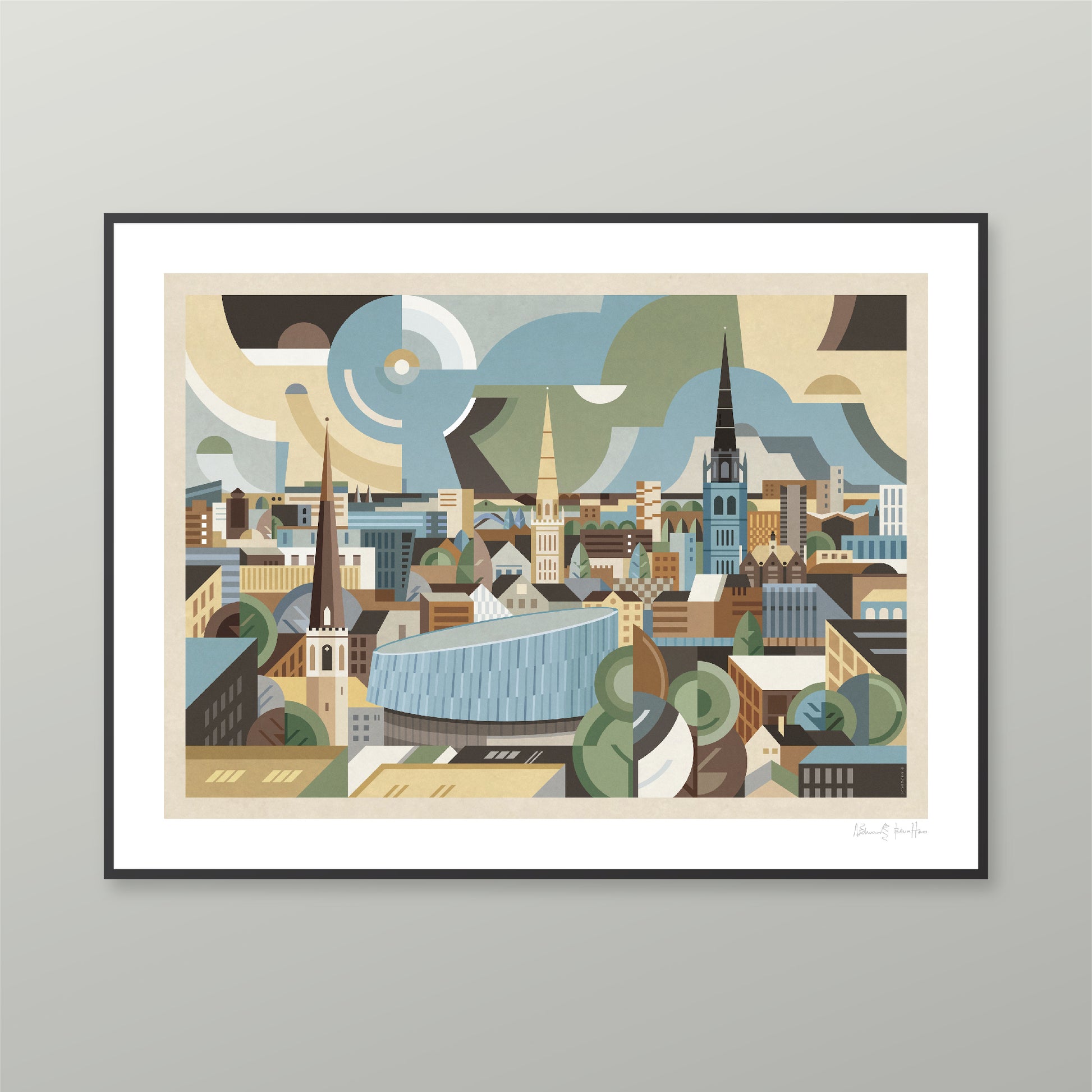 This new print depicts Coventry’s unique cityscape viewed from the south, proudly featuring the three spires of Holy Trinity Church, Christ Church and St Michael’s Cathedral, which dominate the view of the city, and also the prominent new Wave building.