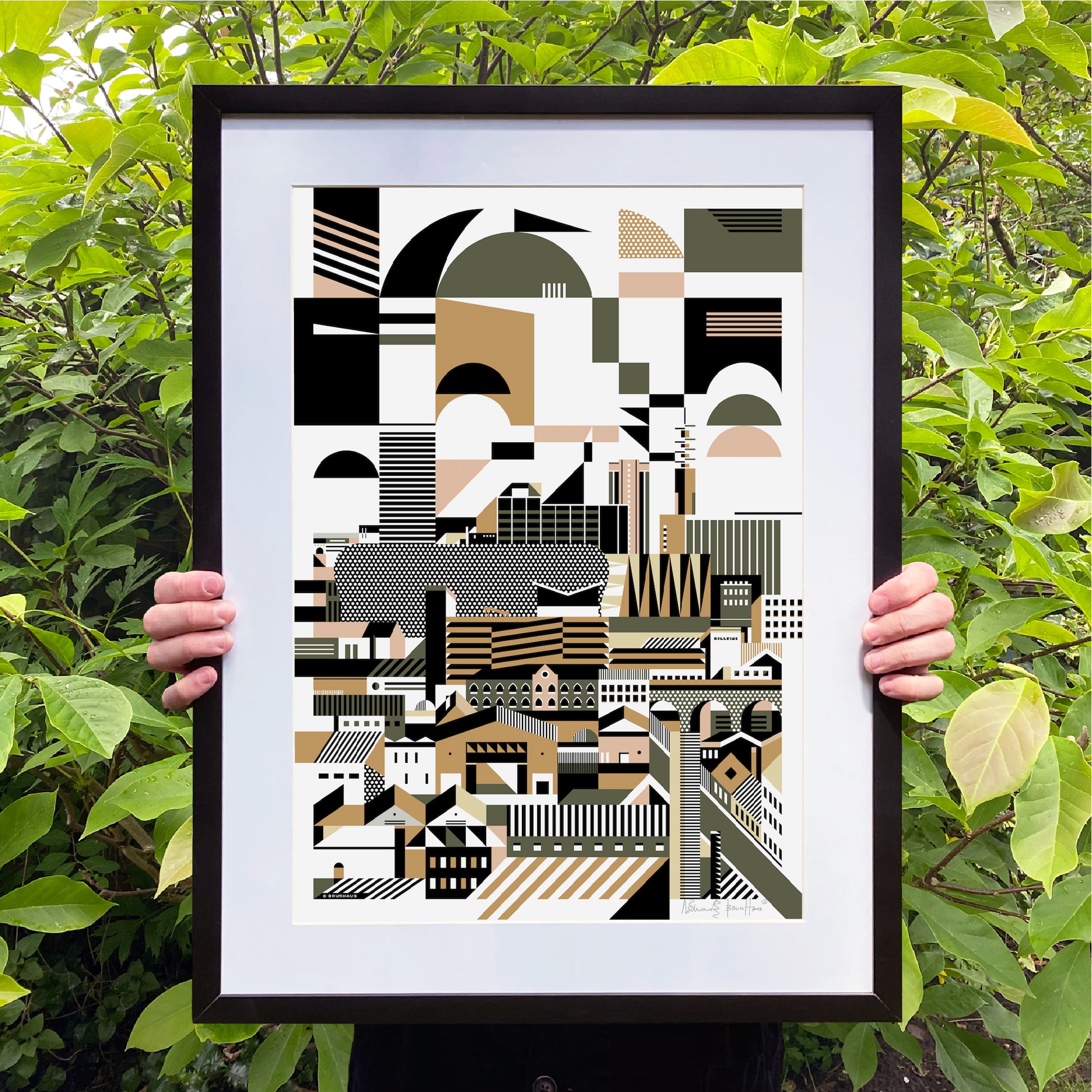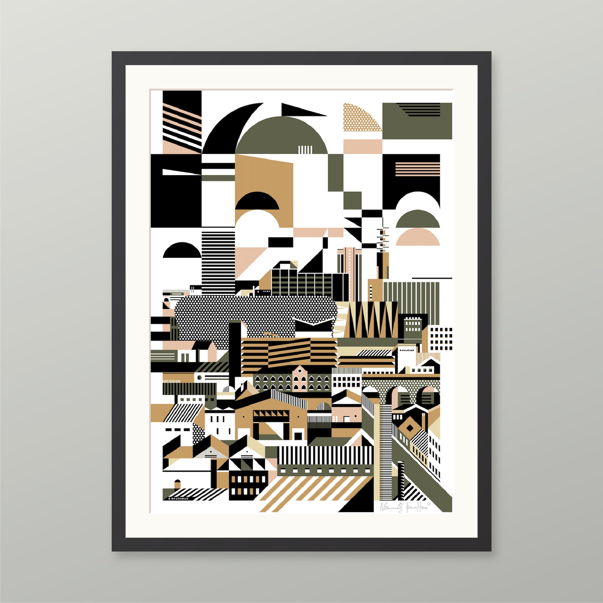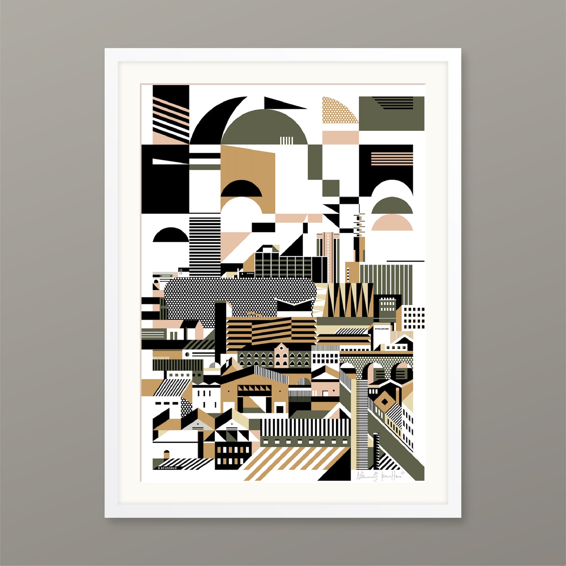 Launched during Birmingham Design Festival 2019, this semi-abstract graphic composition depicts the Birmingham skyline from the Digbeth end of the city.