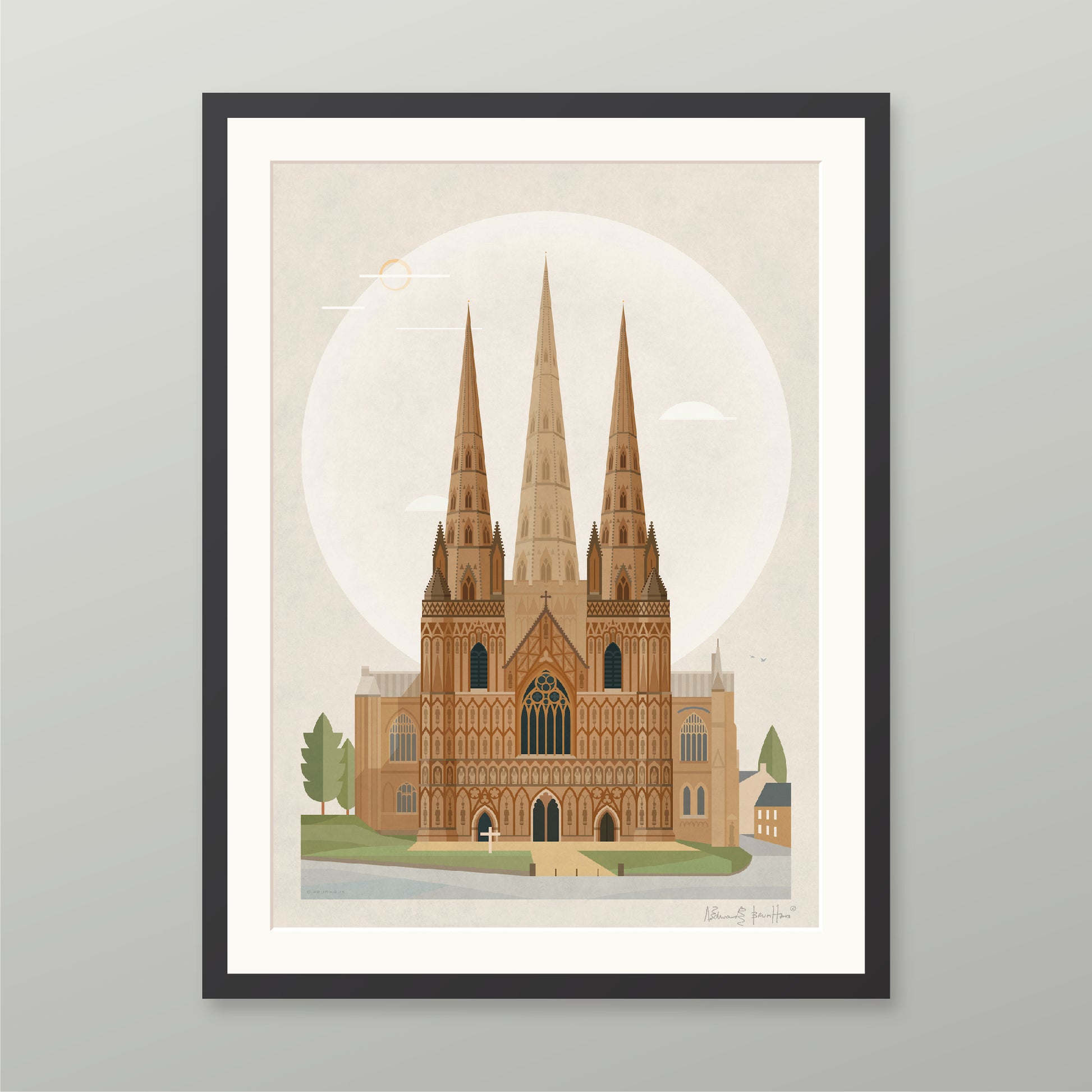 Consisting of a timber frame painted black or white with a smooth finish, or in dark walnut. These come with a white mount, except for the trimmed option. Please note the artist signature appears in the printed area on this option.