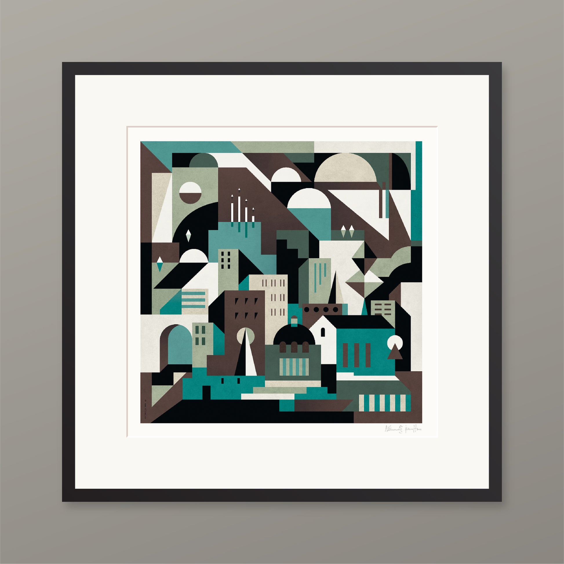 Consisting of a timber frame painted black or white with a smooth finish, or in dark walnut. These come with a white mount, except for the trimmed option. Please note the artist signature appears in the printed area on this option.