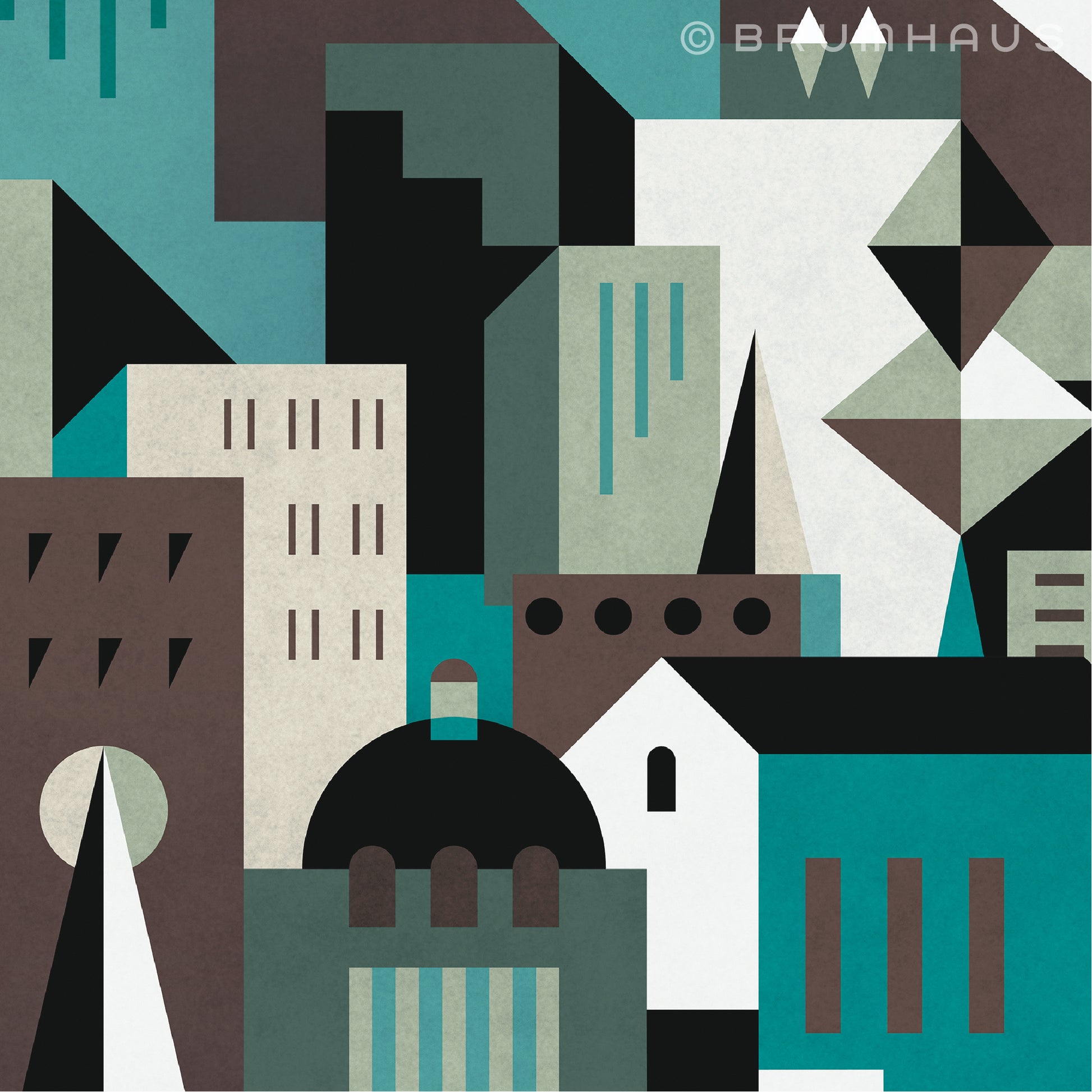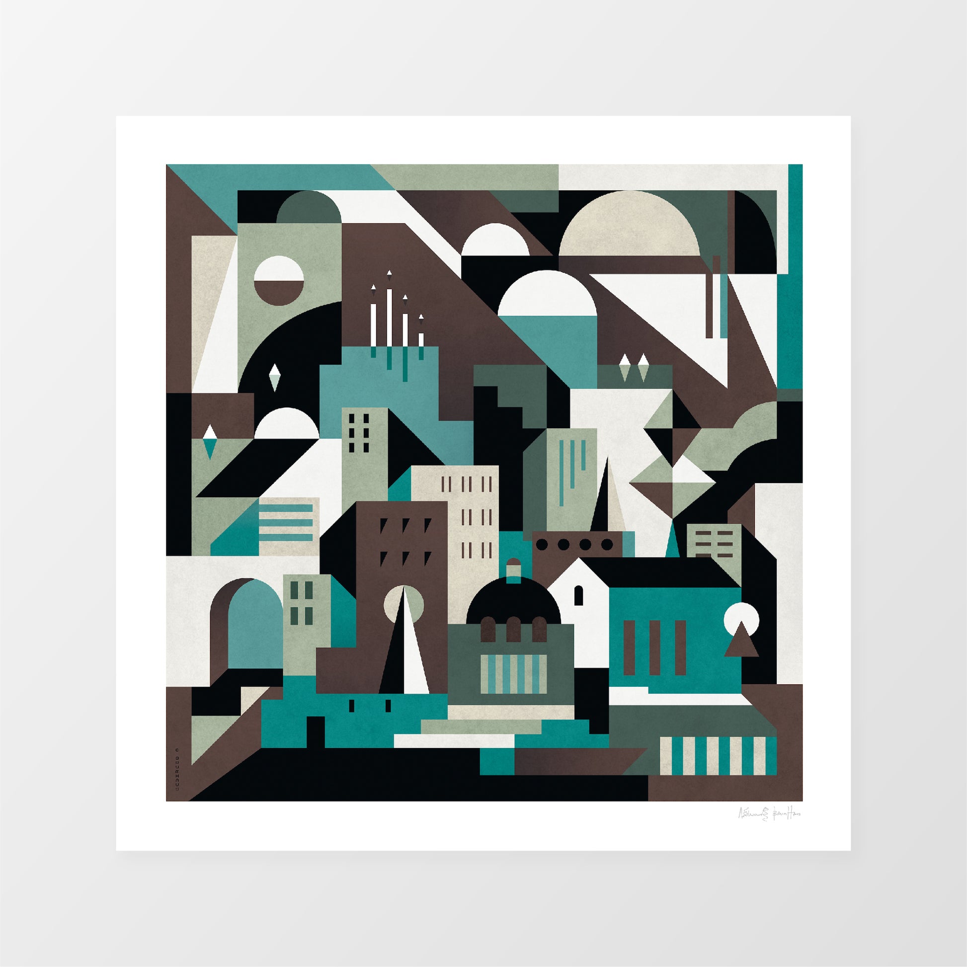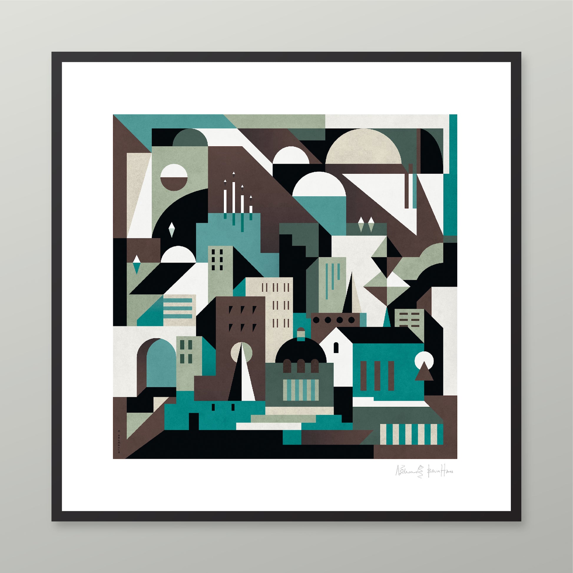 This limited edition giclée print is a view of a made up place, an industrial city at night, where the streets are dark and quiet.