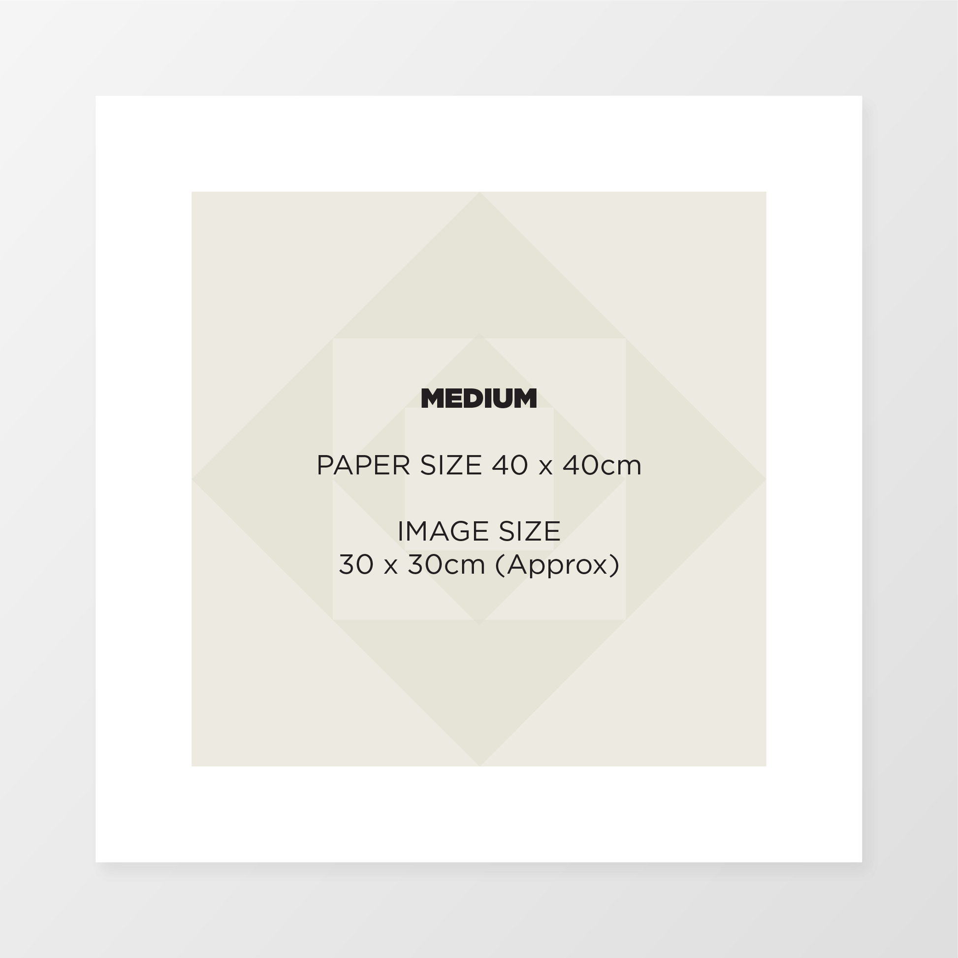 The print is available in three sizes. 40 x 40cm in a Limited Edition of 30, 60 x 60cm in a Limited Edition of 15, and 1m x 1m in a Limited Edition of 5. Once purchased you will also receive a Certificate Of Authenticity.