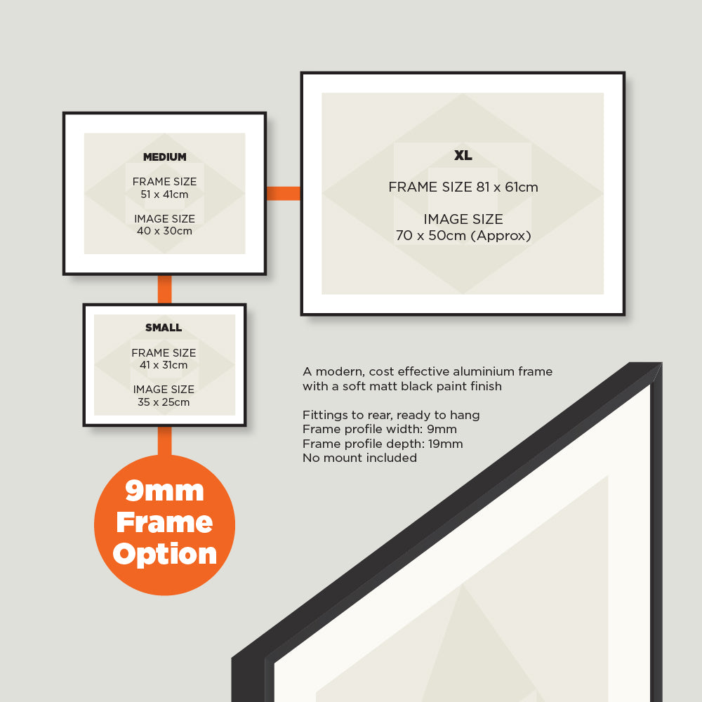 Consisting of a timber frame painted black or white with a smooth finish, or in dark walnut. These come with a white mount, except for the trimmed option. Please note the artist signature appears in the printed area on this option.