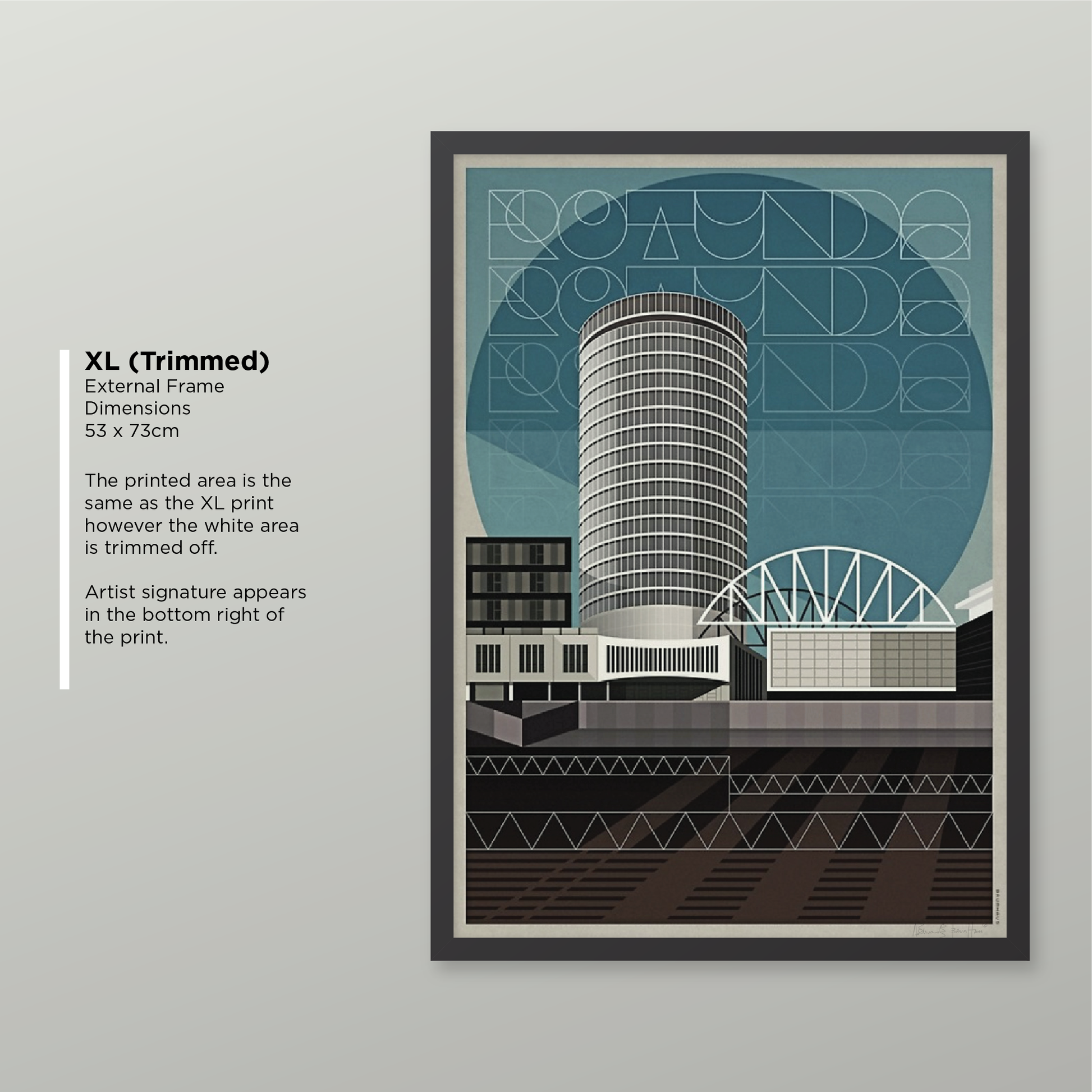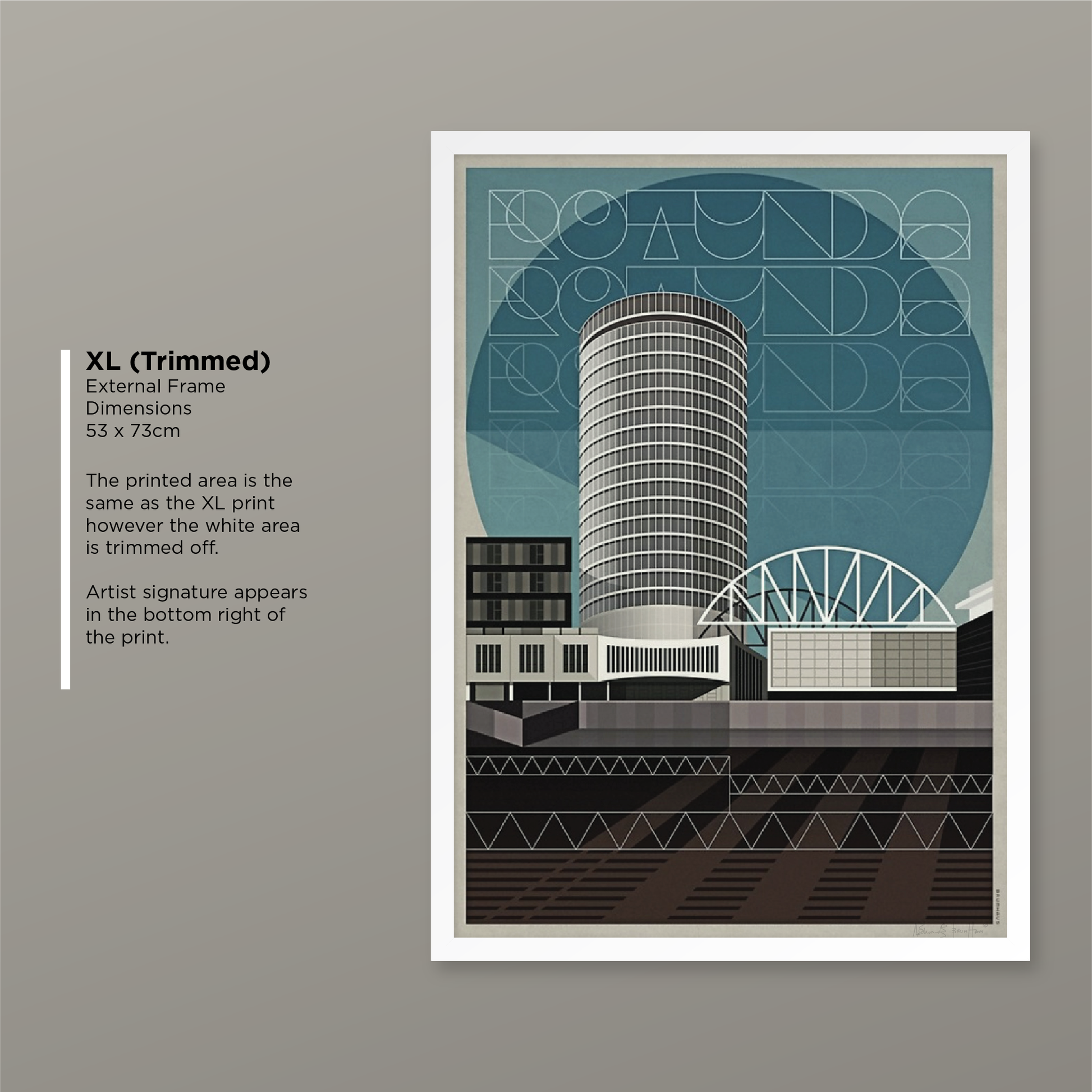XL option is trimmed to the printed area to suit the frame size, and is overall smaller than the XL 23mm frame option. Signature is within the printed area, bottom right.