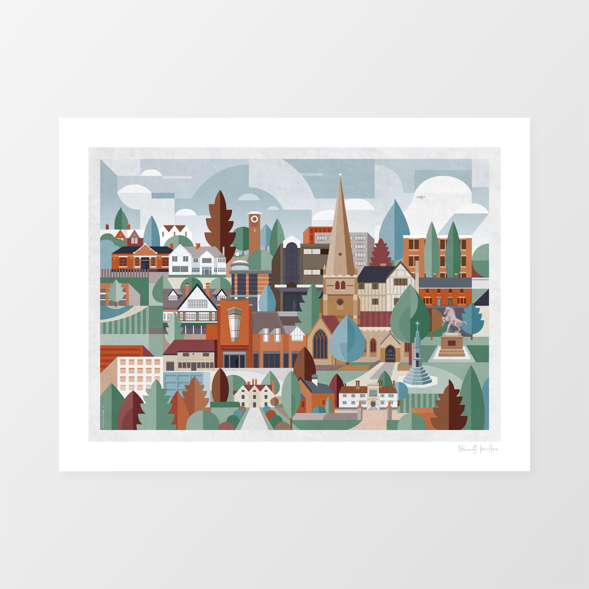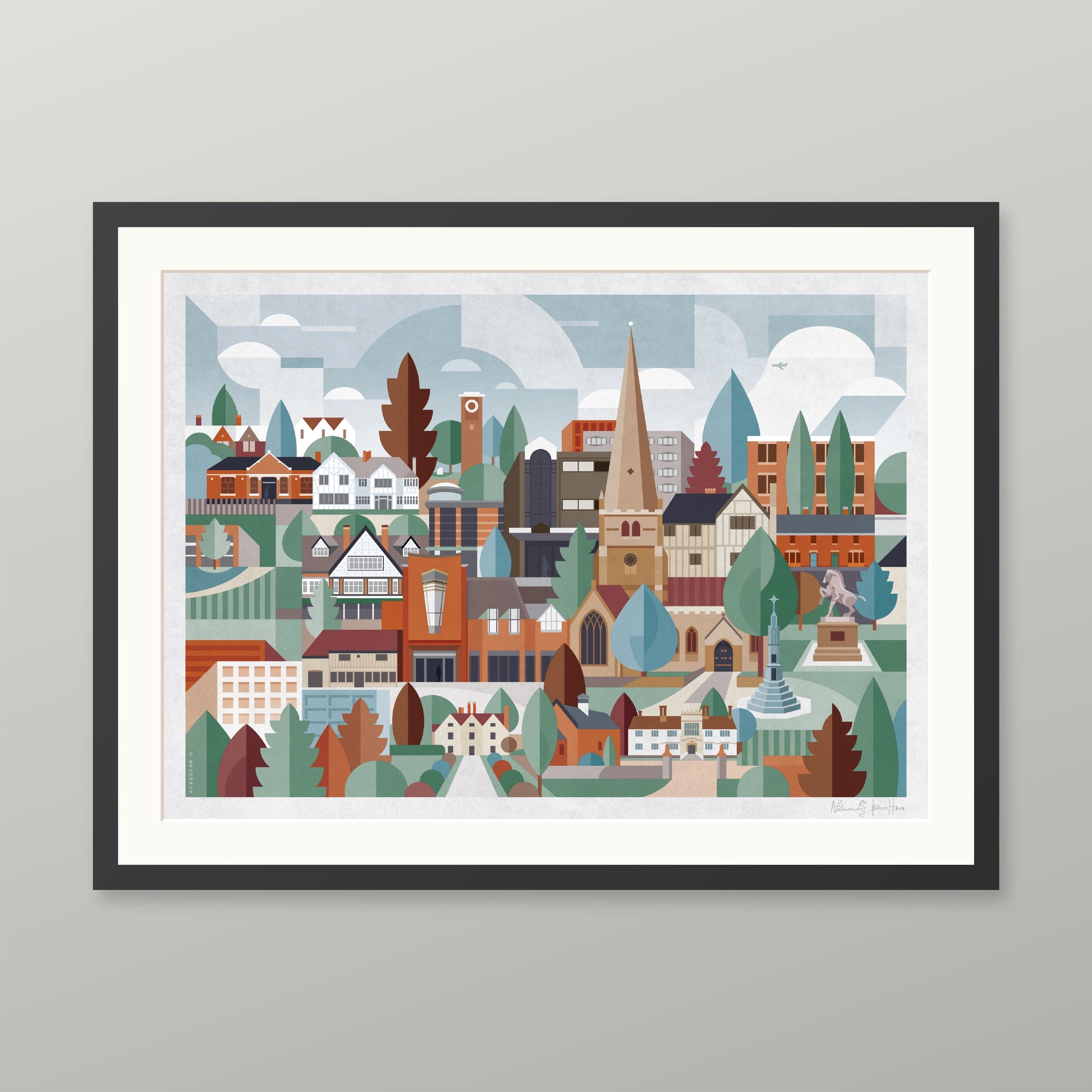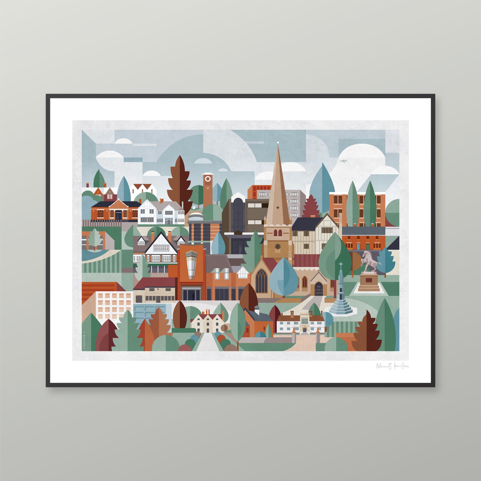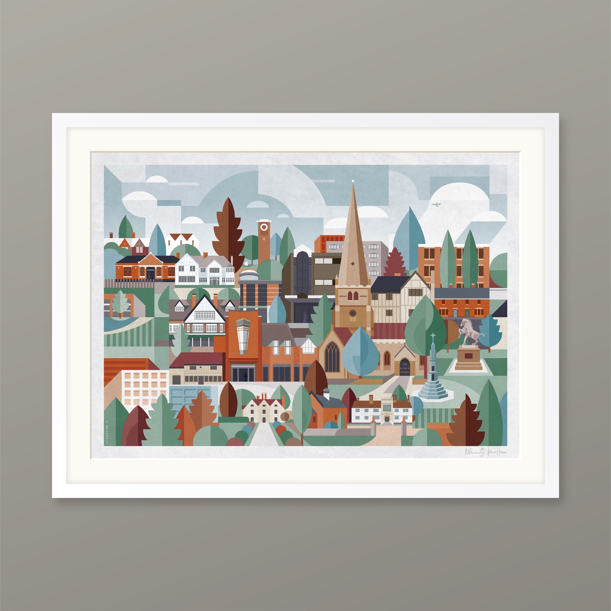 This vibrant artwork encapsulates the essence of this West Midlands town, where historic architecture meets modern elegance.