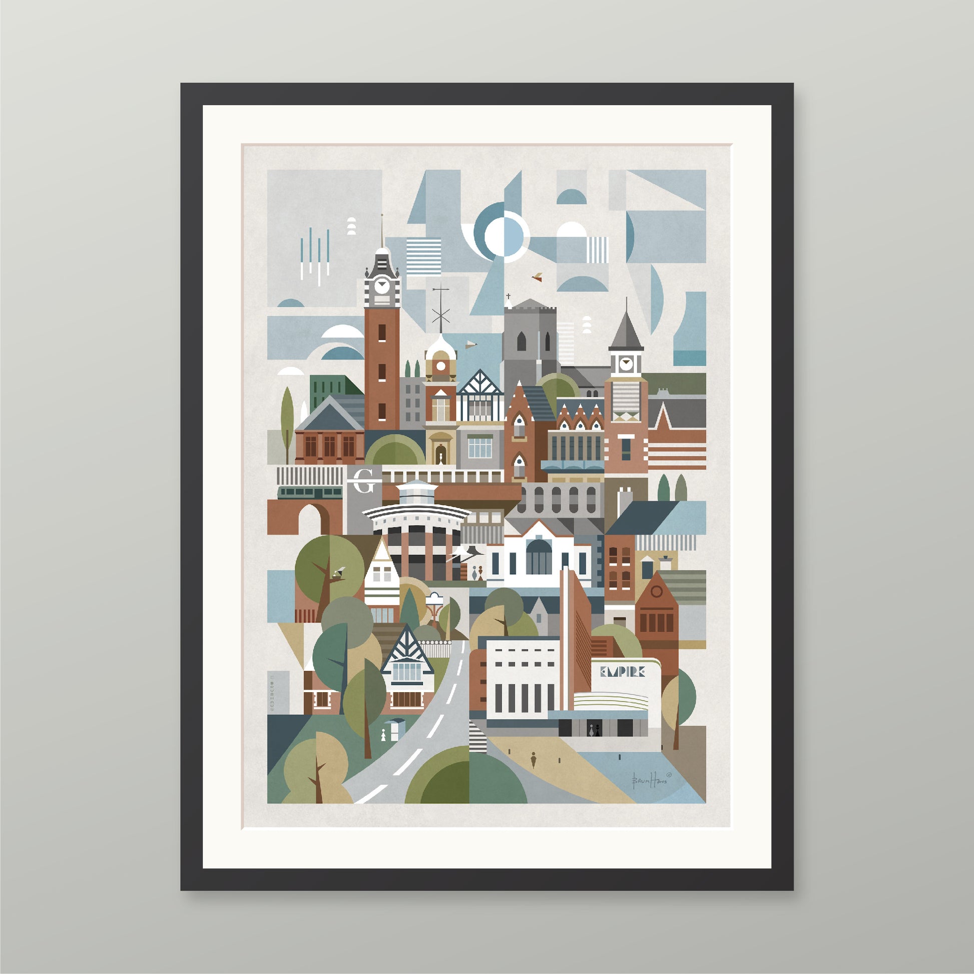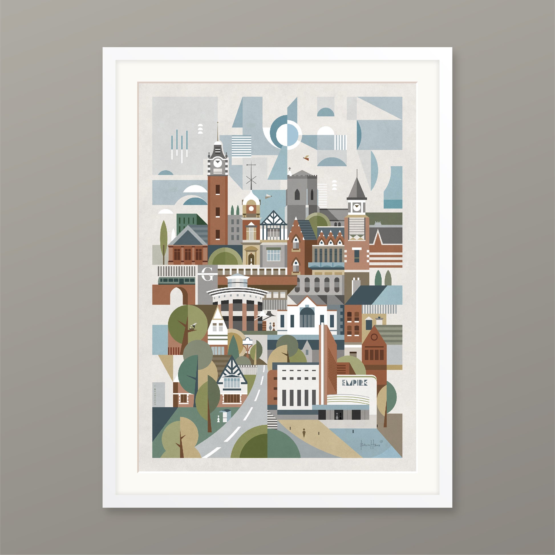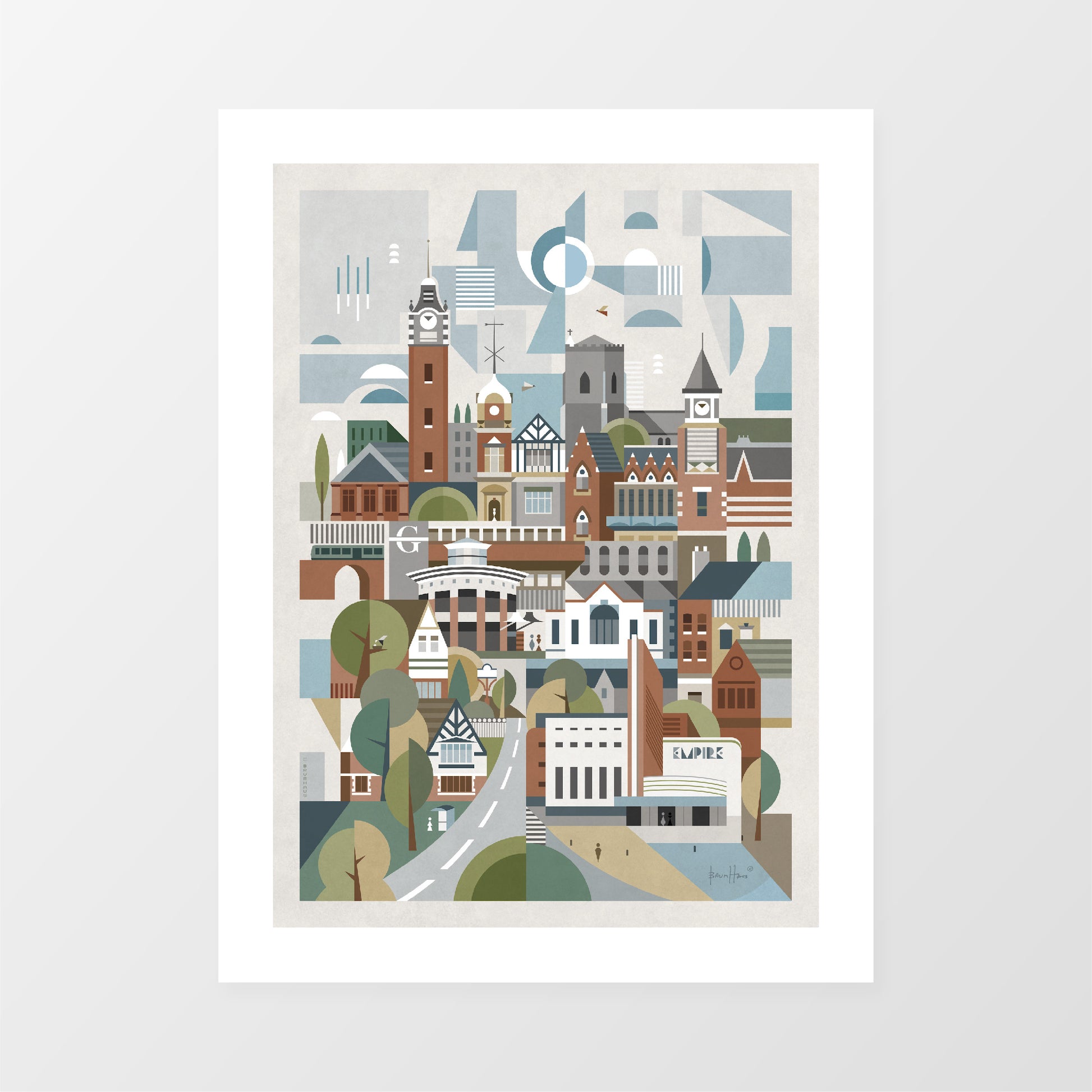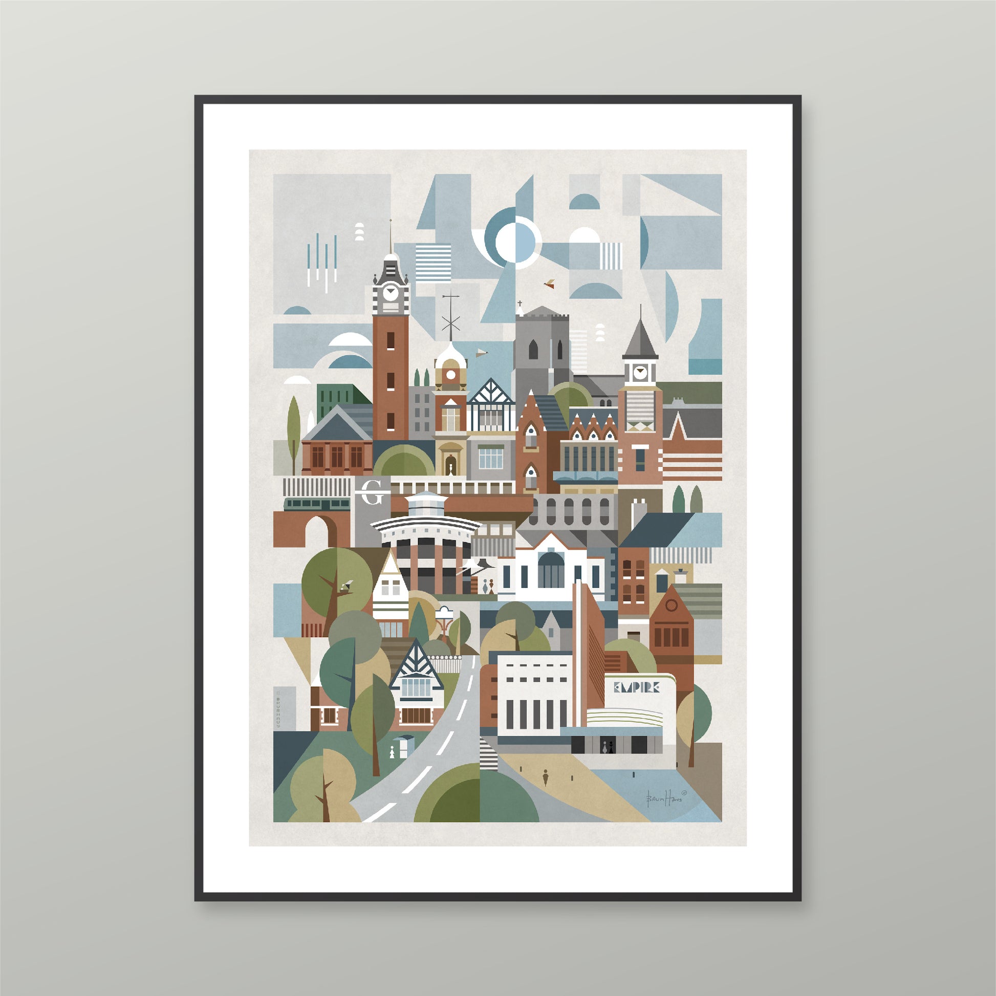 This print captures some of Sutton Coldfield town centre’s key architecture. The top section shows some of the architecture in the northern end of the town such as the Town Hall clock tower, train station, and Holy Trinity Parish Church. In the middle we see the buildings of the Parade and Gracechurch centre. The lower section features some familiar buildings on the approach to the town centre along Birmingham Road, most notable of which is the art deco Empire Cinema (Sutton Odeon).