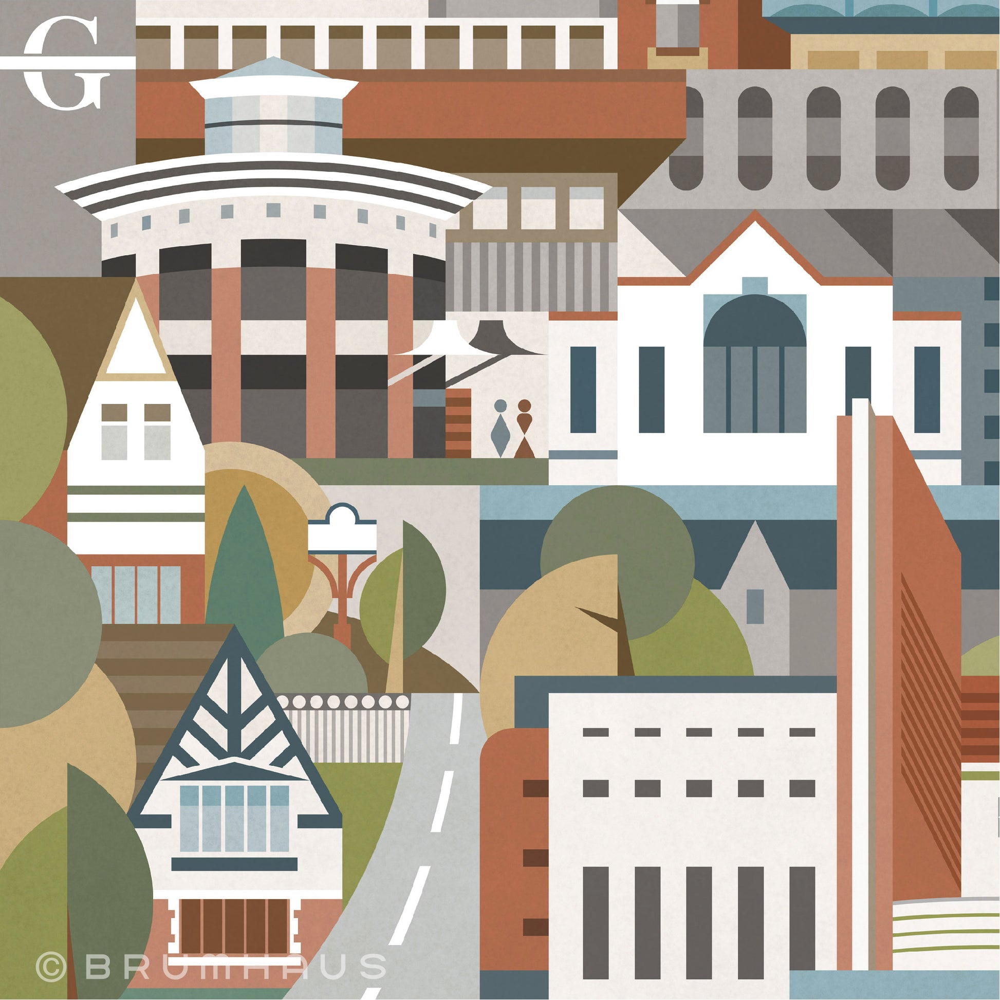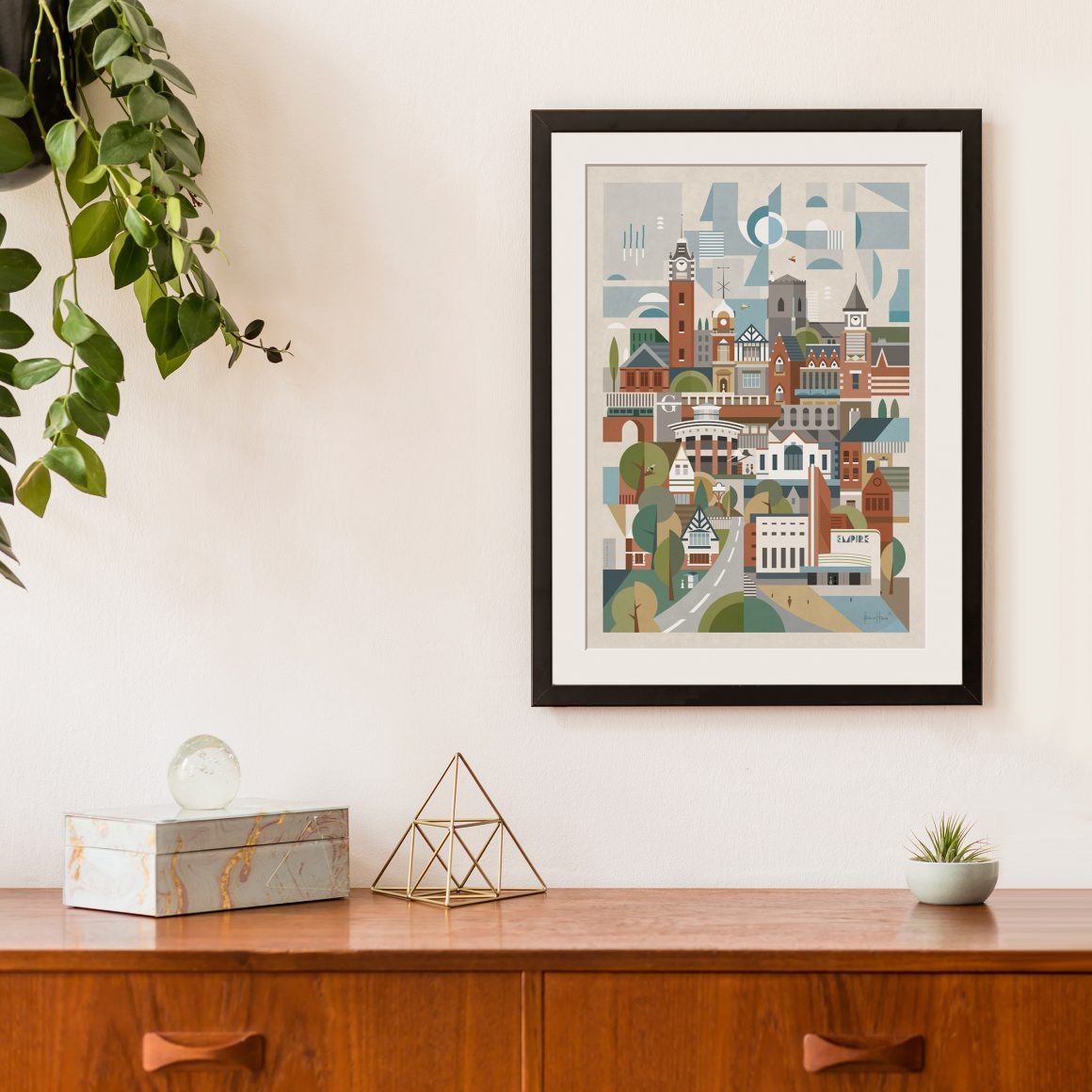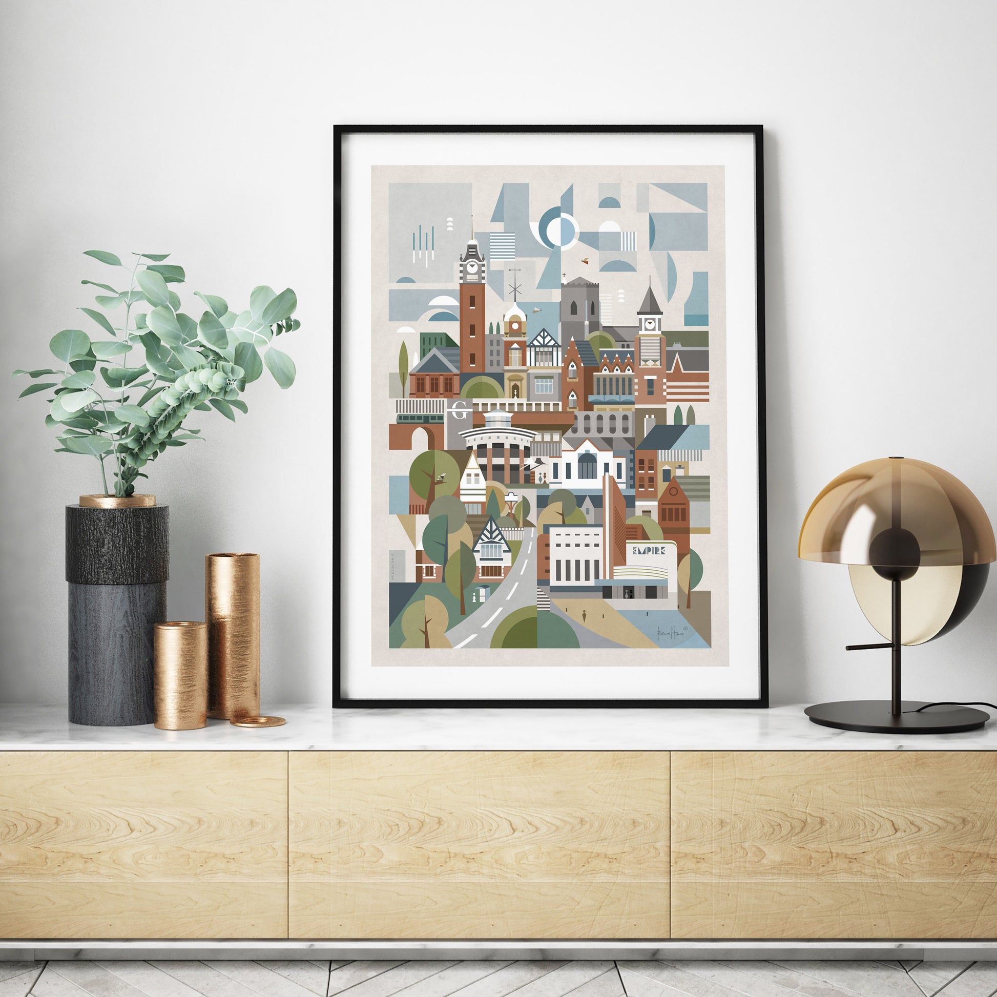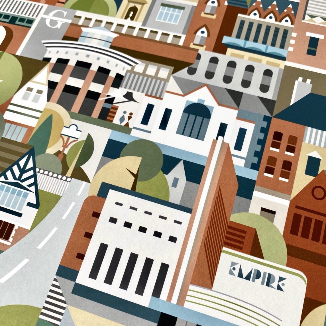This print captures some of Sutton Coldfield town centre’s key architecture. The top section shows some of the architecture in the northern end of the town such as the Town Hall clock tower, train station, and Holy Trinity Parish Church. In the middle we see the buildings of the Parade and Gracechurch centre. The lower section features some familiar buildings on the approach to the town centre along Birmingham Road, most notable of which is the art deco Empire Cinema (Sutton Odeon).