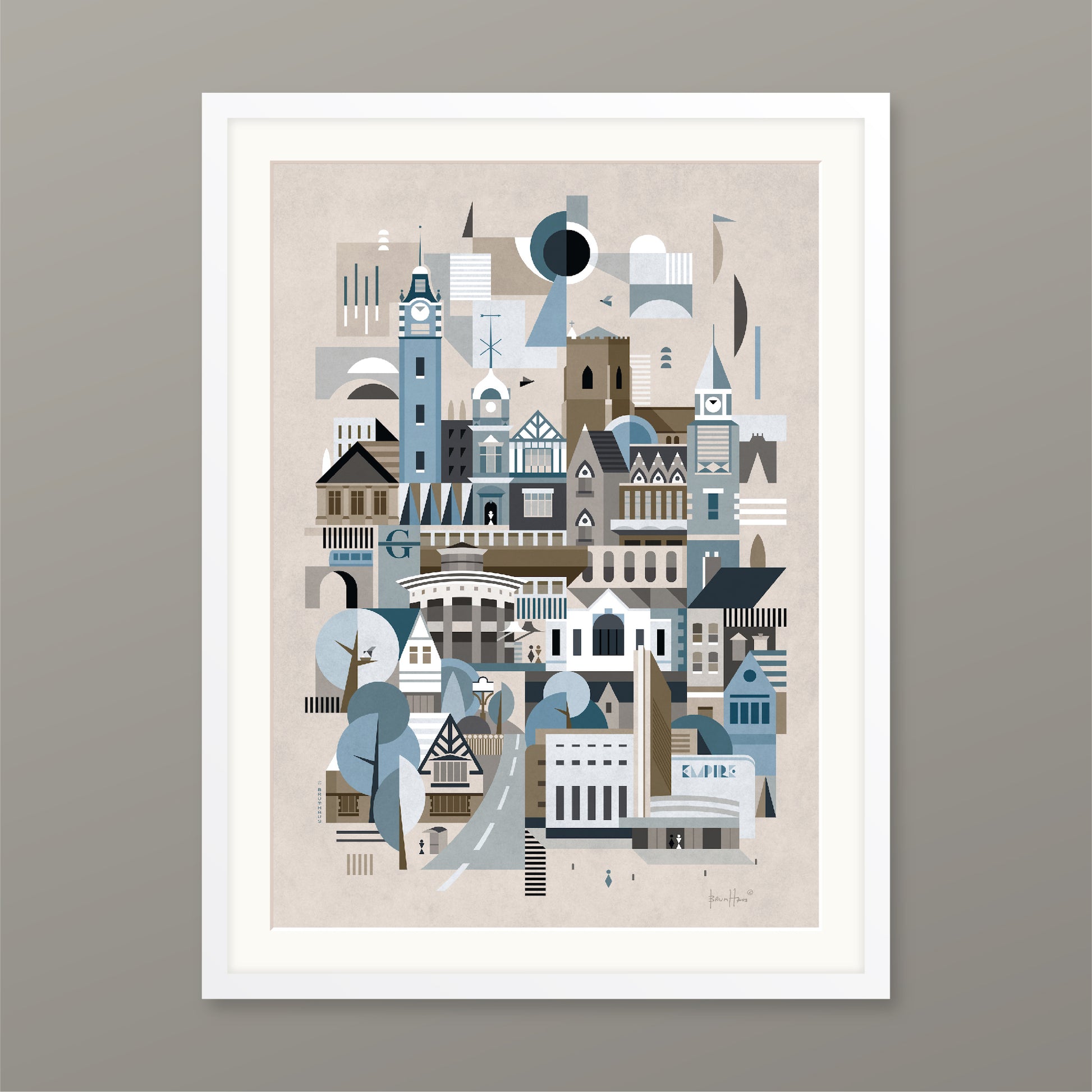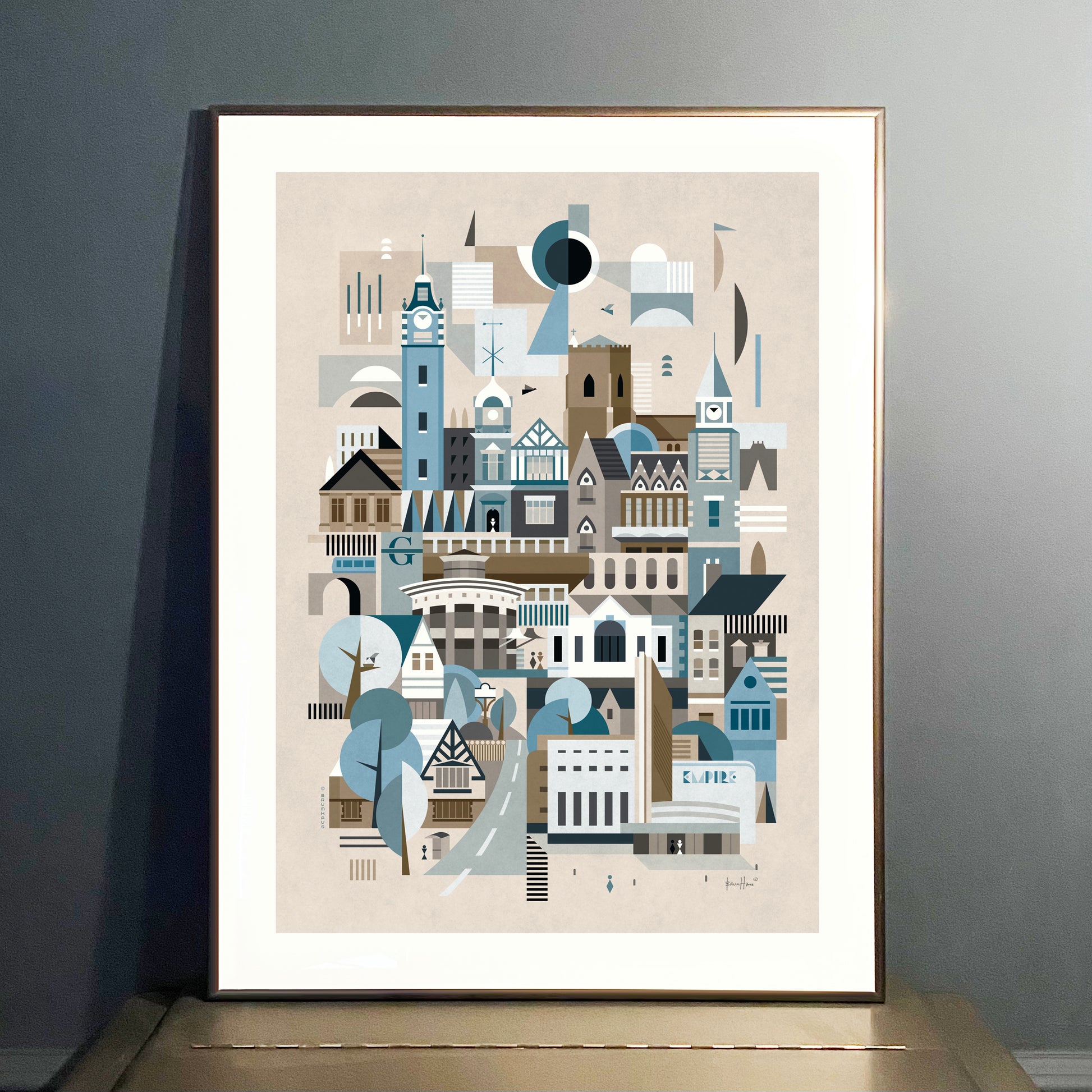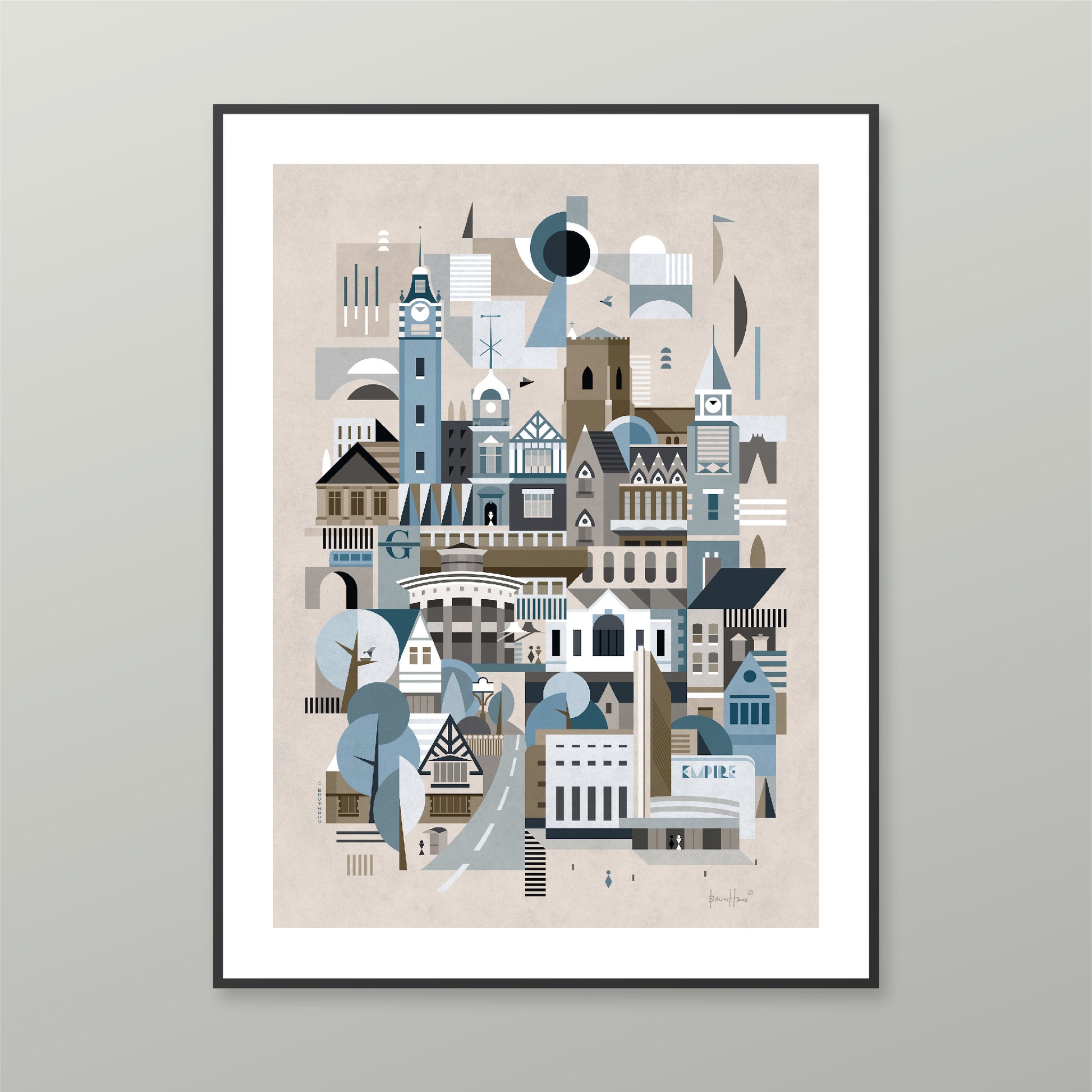 This print captures some of Sutton Coldfield town centre’s key architecture. The top section shows some of the architecture in the northern end of the town such as the Town Hall clock tower, train station, and Holy Trinity Parish Church. In the middle we see the buildings of the Parade and Gracechurch centre. The lower section features some familiar buildings on the approach to the town centre along Birmingham Road, most notable of which is the art deco Empire Cinema.