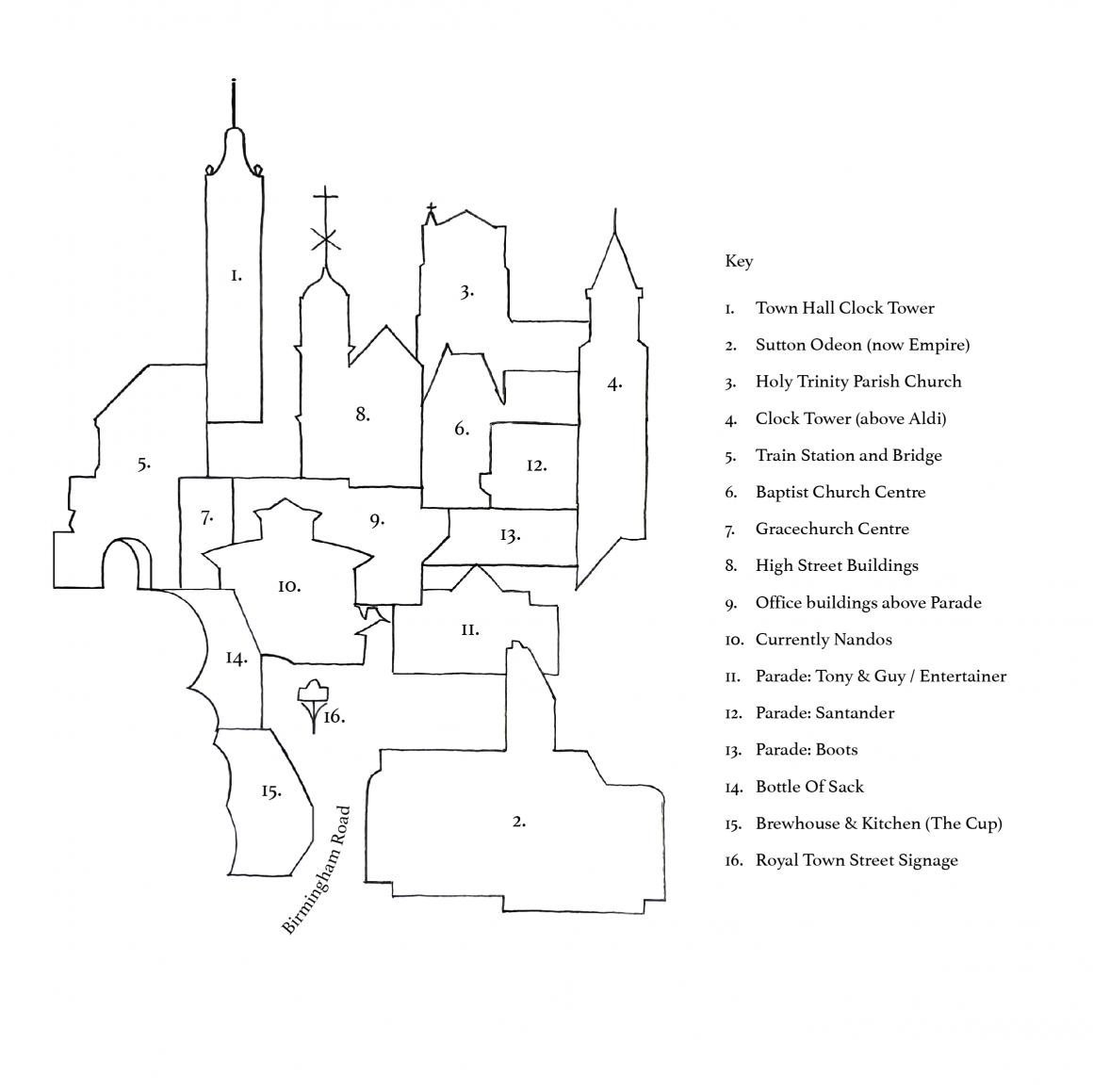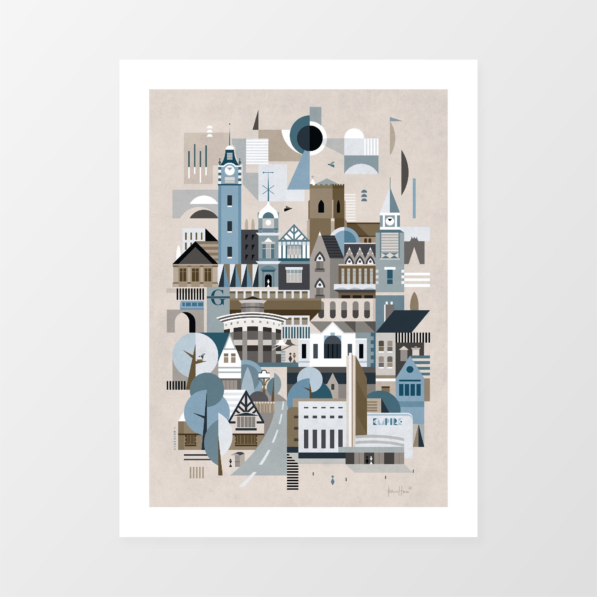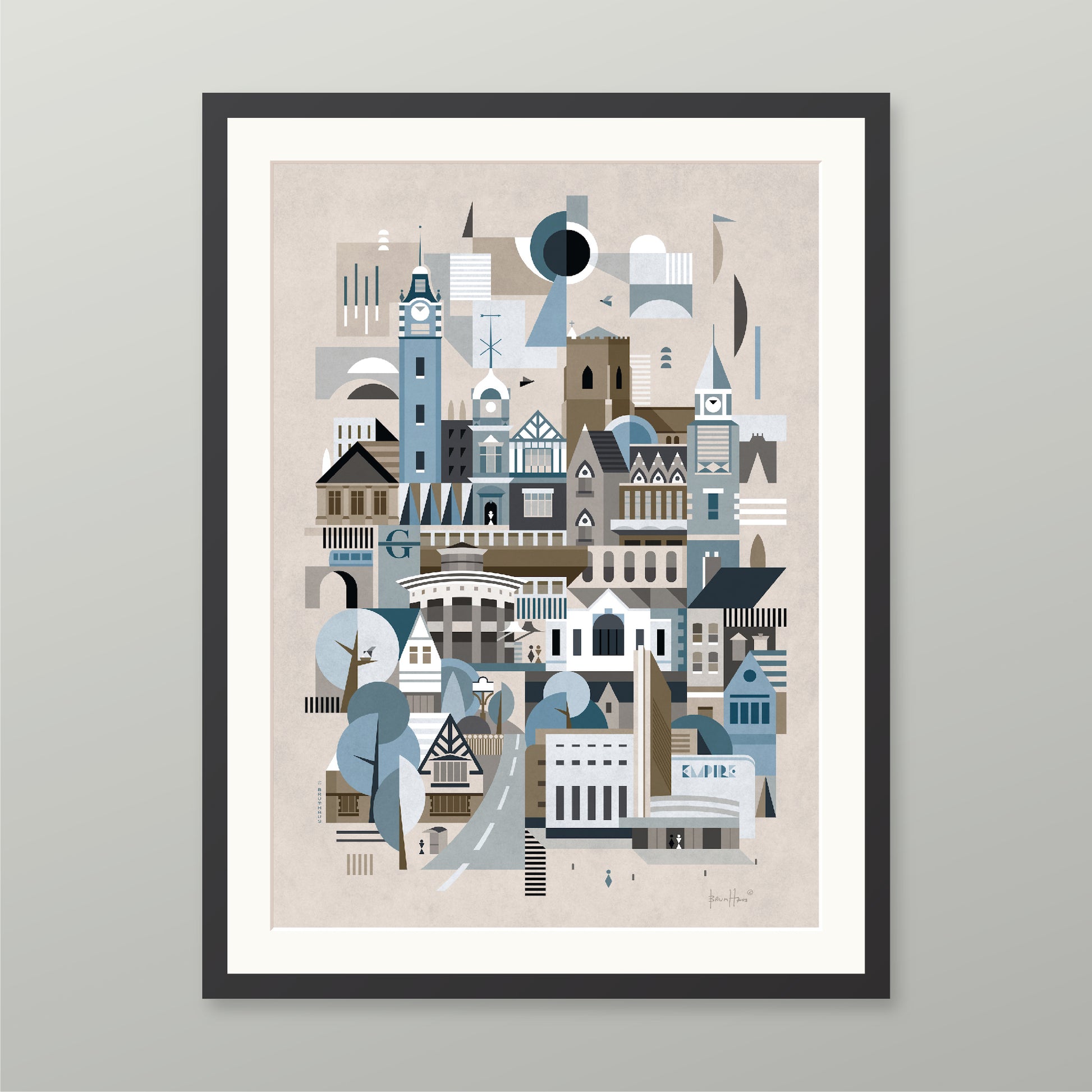 This print captures some of Sutton Coldfield town centre’s key architecture. The top section shows some of the architecture in the northern end of the town such as the Town Hall clock tower, train station, and Holy Trinity Parish Church. In the middle we see the buildings of the Parade and Gracechurch centre. The lower section features some familiar buildings on the approach to the town centre along Birmingham Road, most notable of which is the art deco Empire Cinema.