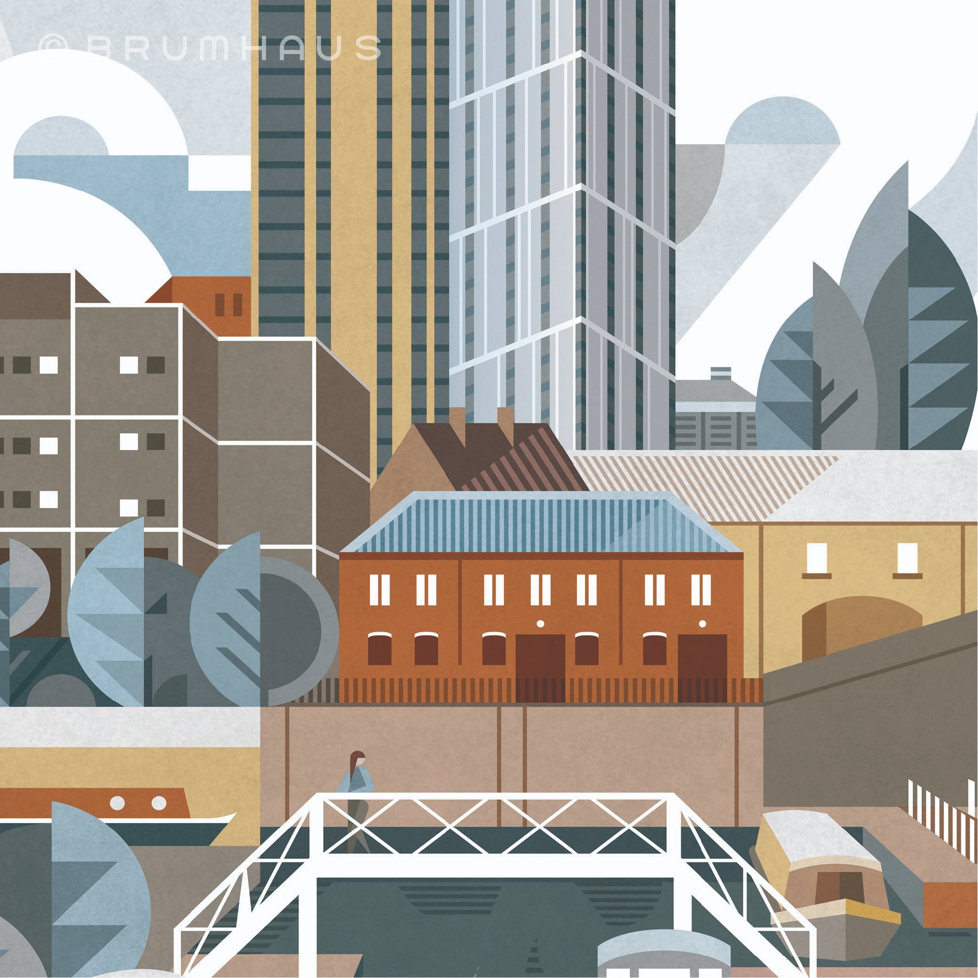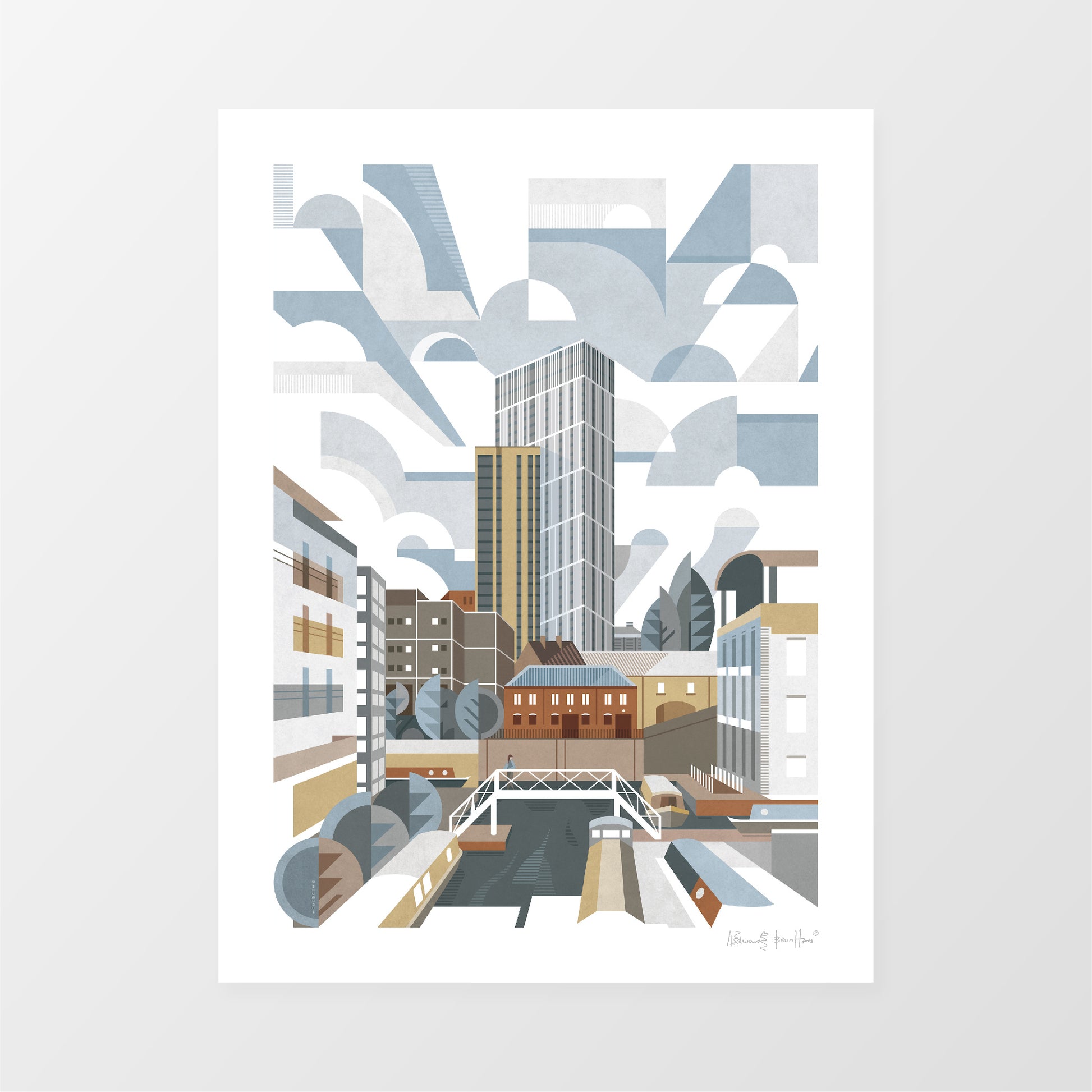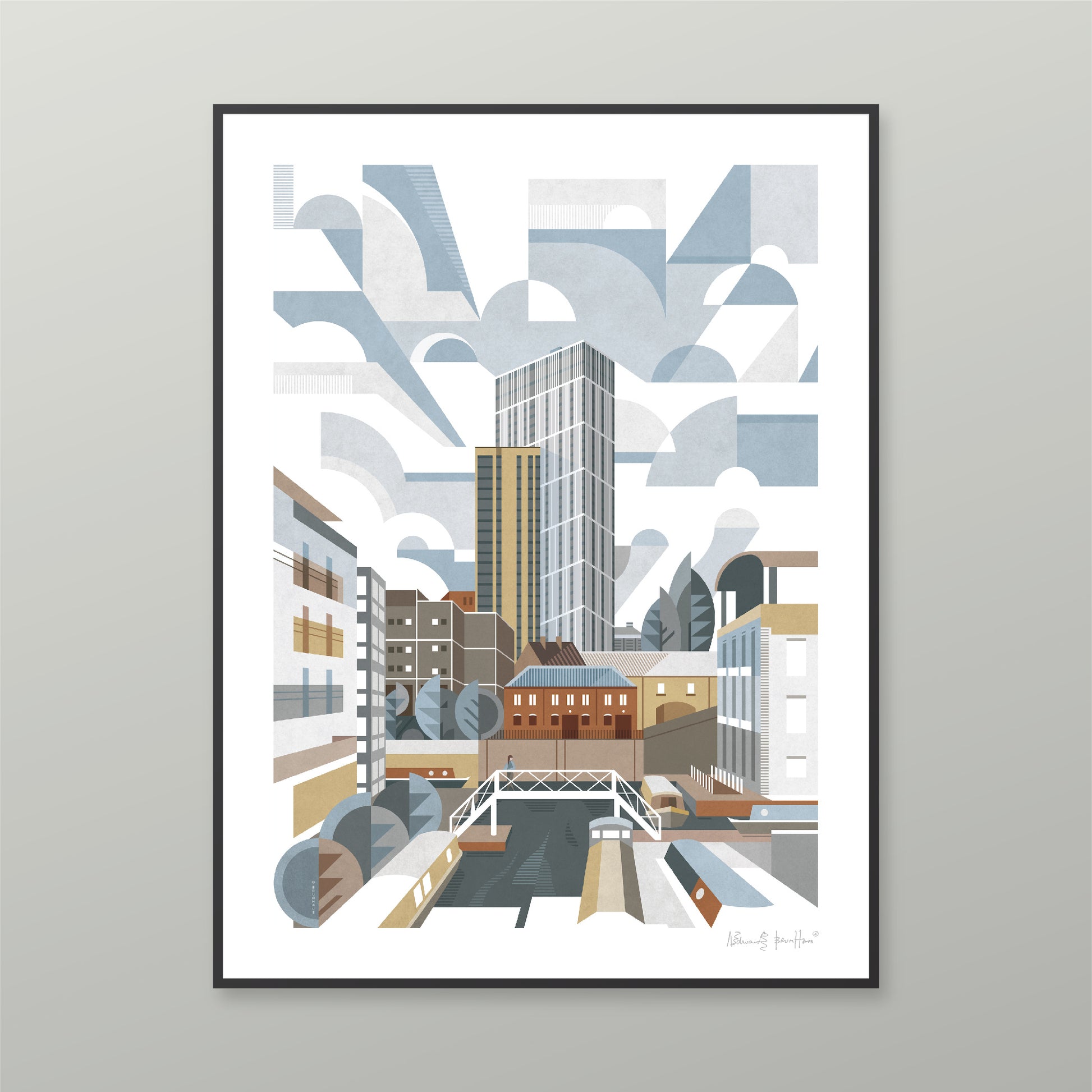 This view of the towers is taken from Birmingham Canal Old Line and also details a selection of buildings around Sherborne Wharf at the back of Broad Street; somewhere which in recent years has become a hub for city living. Here we see the canal ways and skyscrapers which define the city.