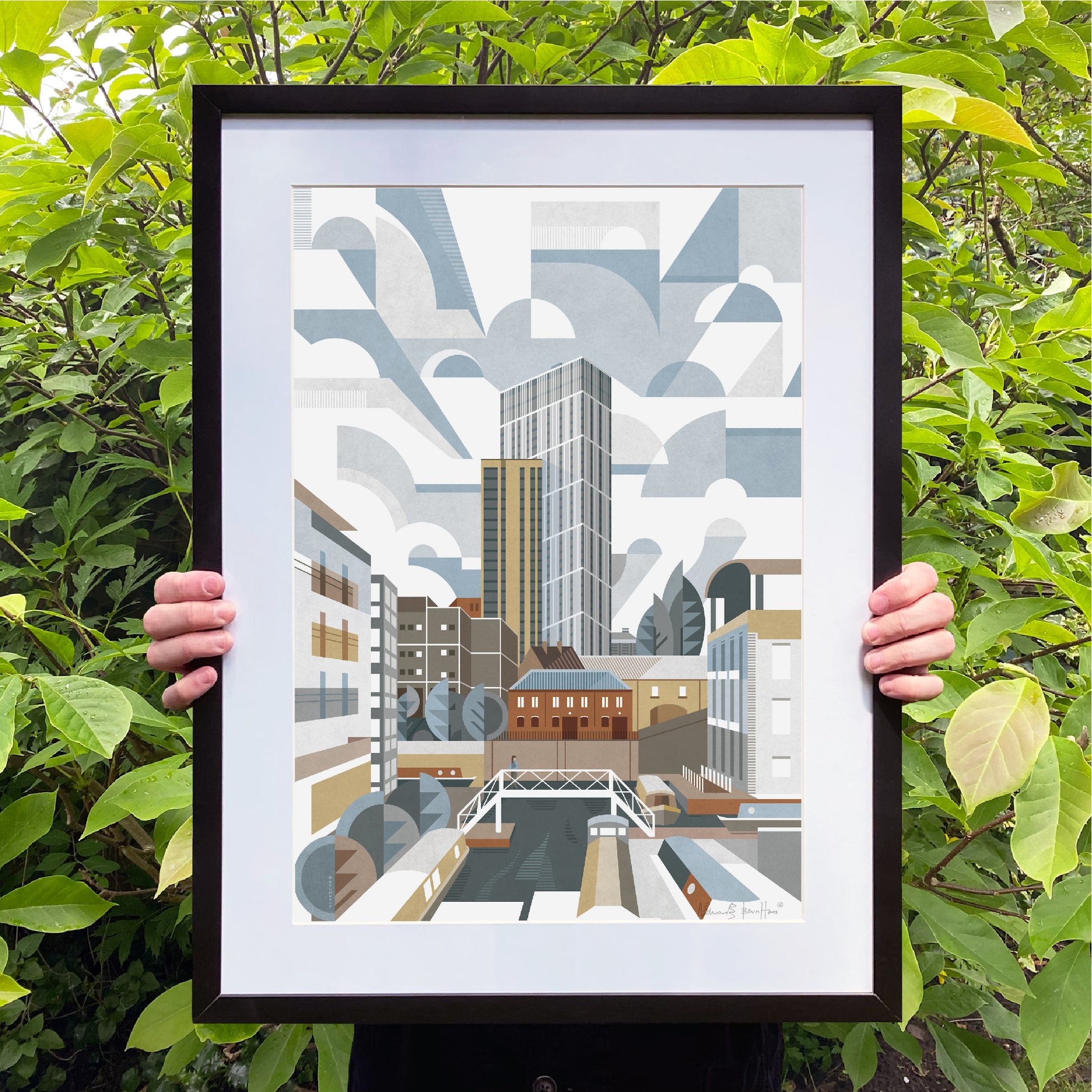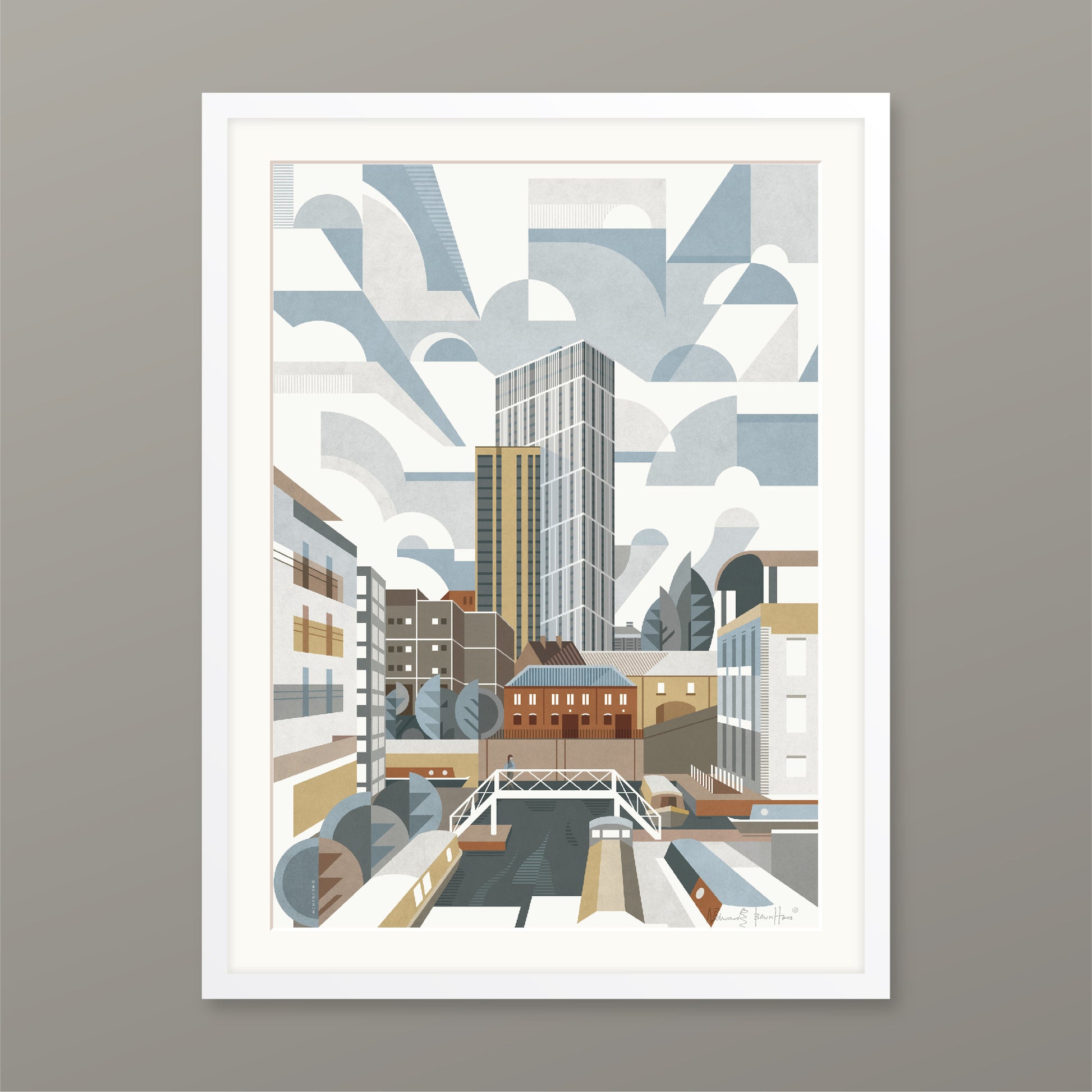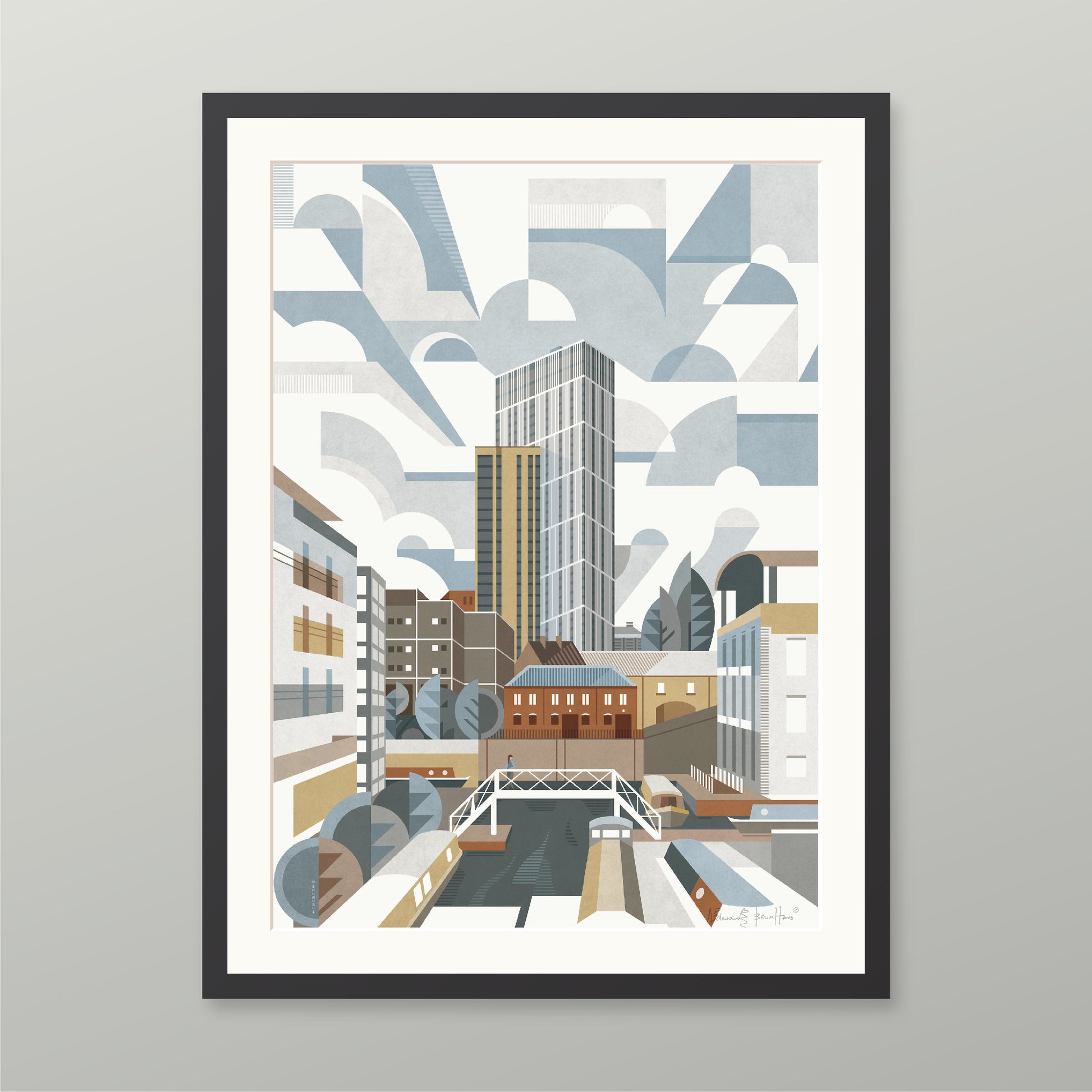 This view of the towers is taken from Birmingham Canal Old Line and also details a selection of buildings around Sherborne Wharf at the back of Broad Street; somewhere which in recent years has become a hub for city living. Here we see the canal ways and skyscrapers which define the city.