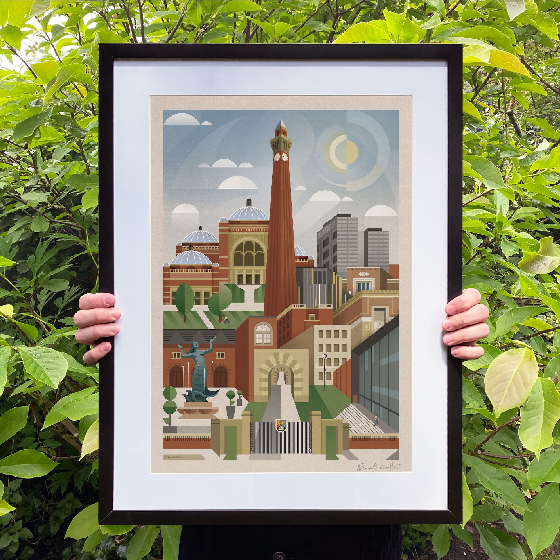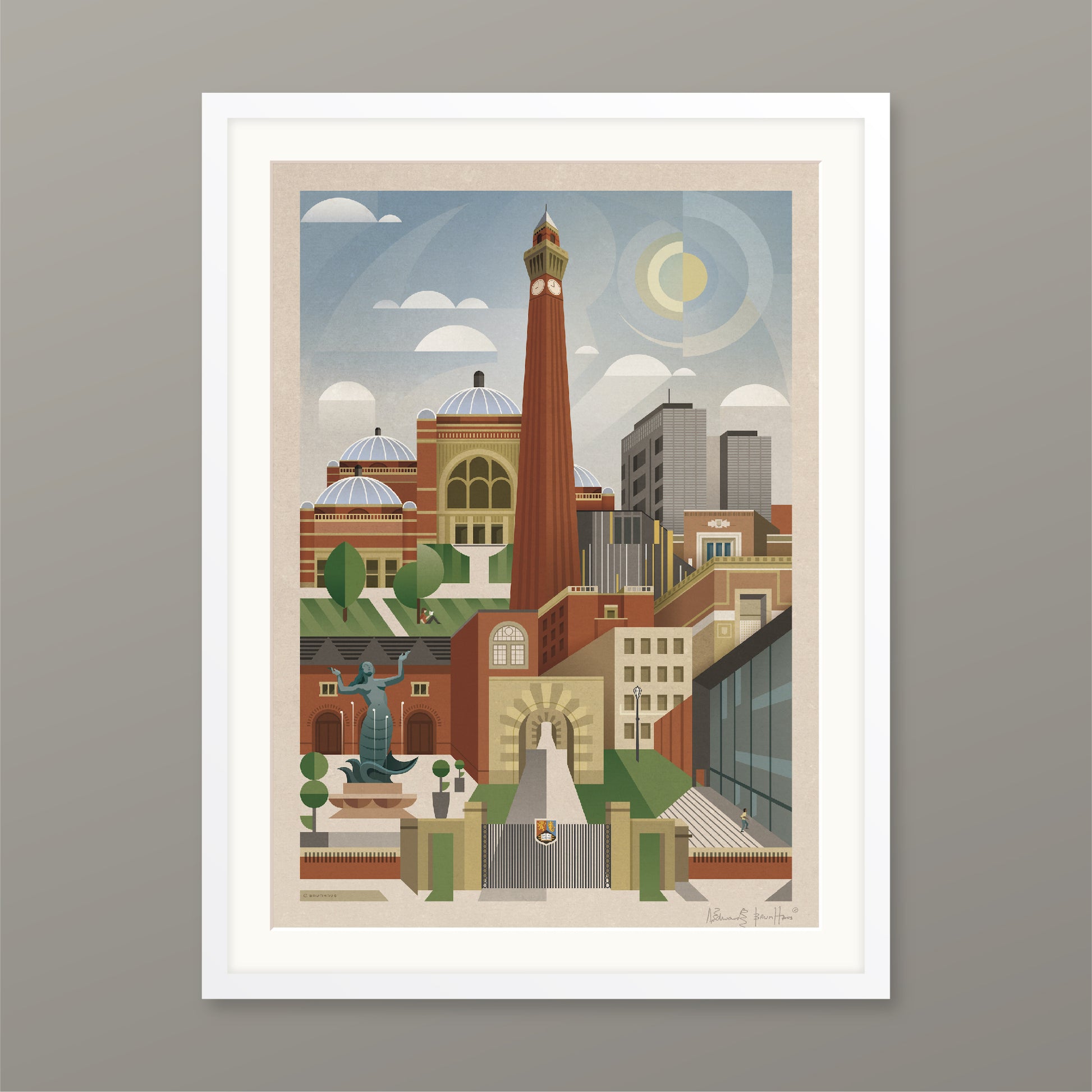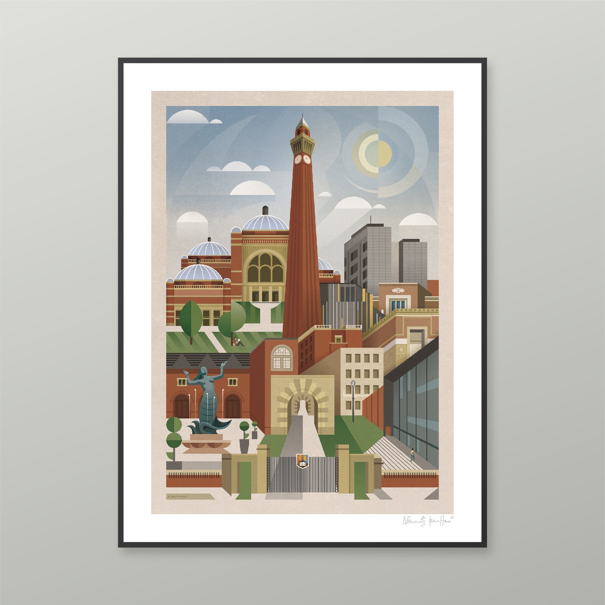 You can have your very own Old Joe in your home or office. From the red bricks of Aston Webb to the modern Library building, this artwork features much of the standout architecture around the campus. The perfect gift for graduates and proud Uni staff. Commissioned for the University of Birmingham, this piece is the most popular Brumhaus print to date.